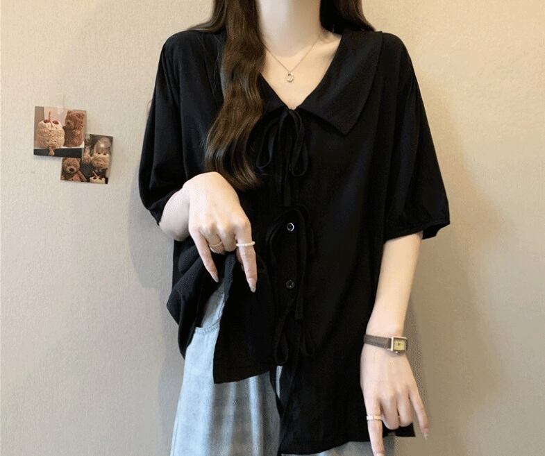 トップス レディース 半袖 ブラウス リボン ゆったり 大きいサイズ 体型カバー お腹隠し 無地 シンプル おしゃれ デート H4453