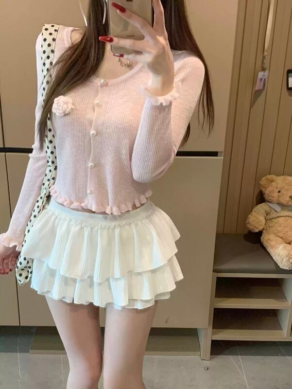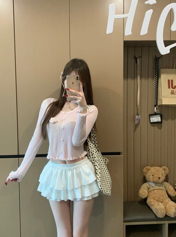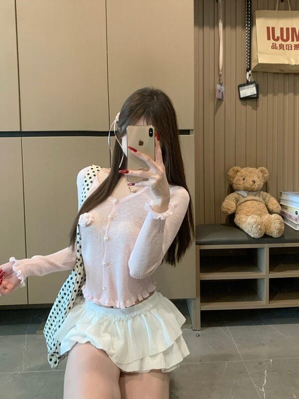 トップス レディース カーディガン ショート丈 長袖 フリル ニット アイスシルク フラワー 装飾 ガーリー キュート MH4515