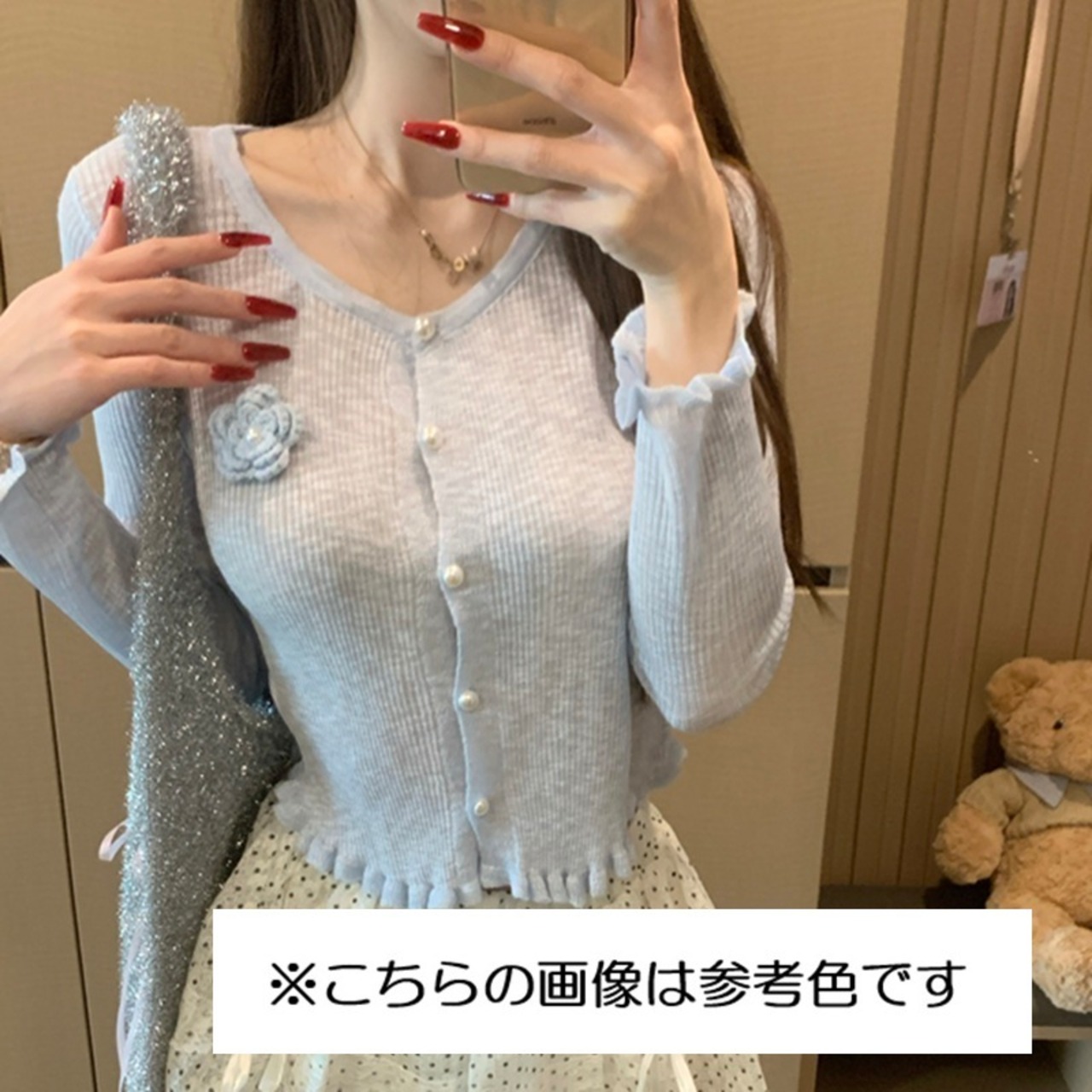 トップス レディース カーディガン ショート丈 長袖 フリル ニット アイスシルク フラワー 装飾 ガーリー キュート MH4518