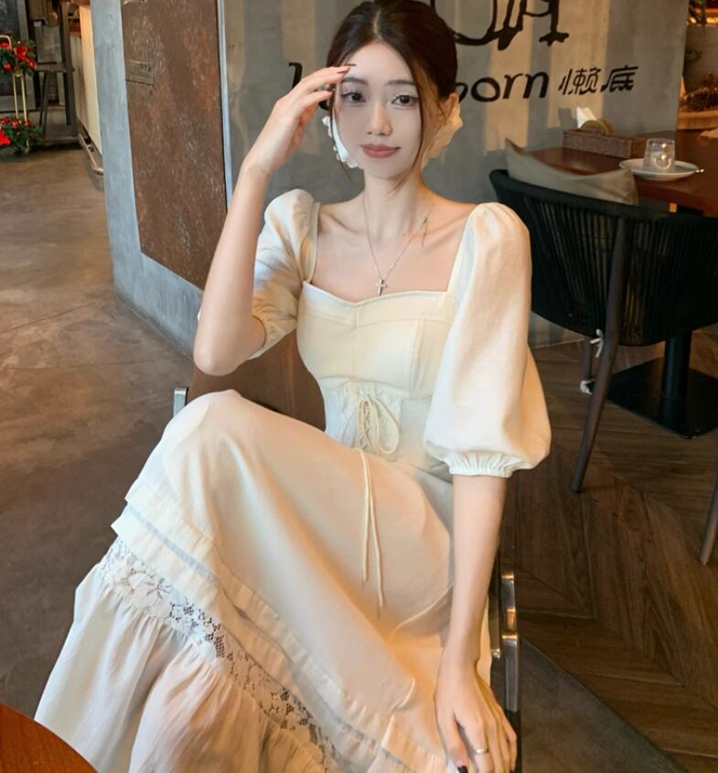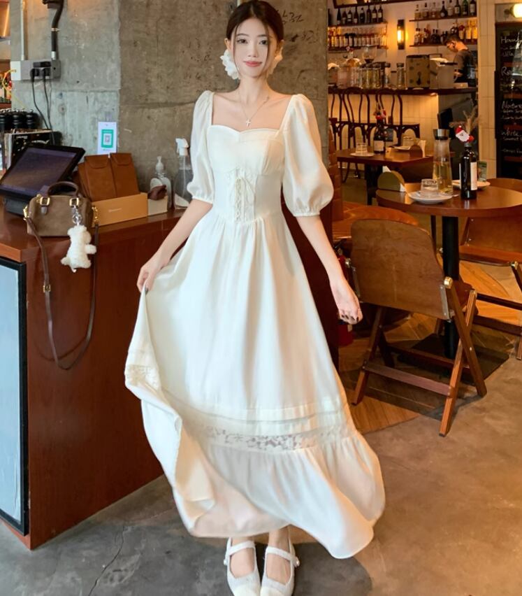 ワンピース レディース 春夏 スクエアネック ロング丈 ハイウエスト パフスリーブ 体型カバー ガーリー フェミニン 半袖 無地 プチプラ ab3347
