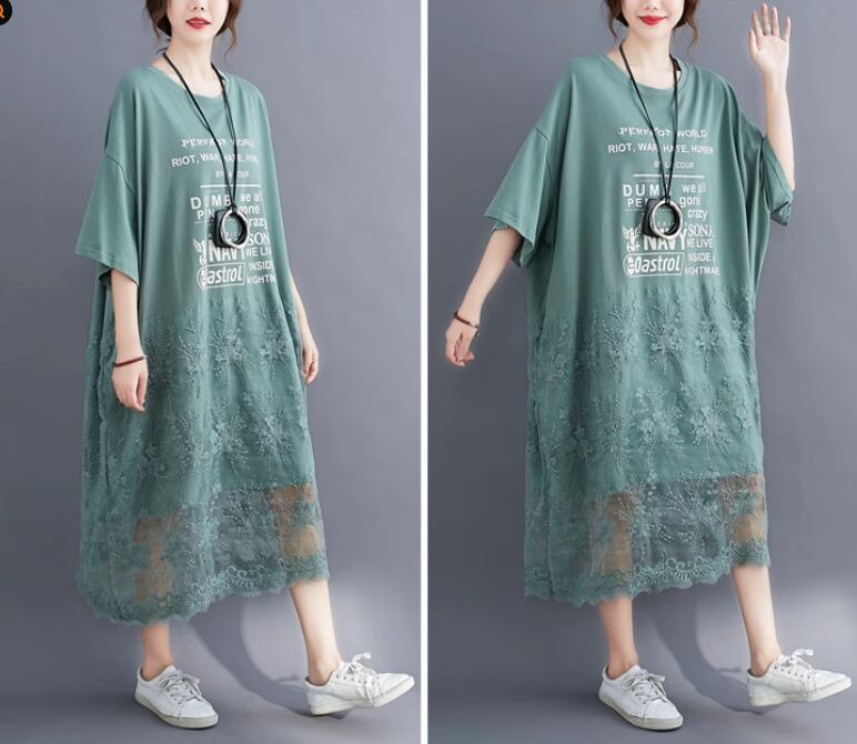 ロンT ロングTシャツ ワンピース レディース 春夏 大きいサイズ カジュアル 五分袖 レース 異素材MIX ガーリー ラウンドネック ゆったり グリーン ab3361