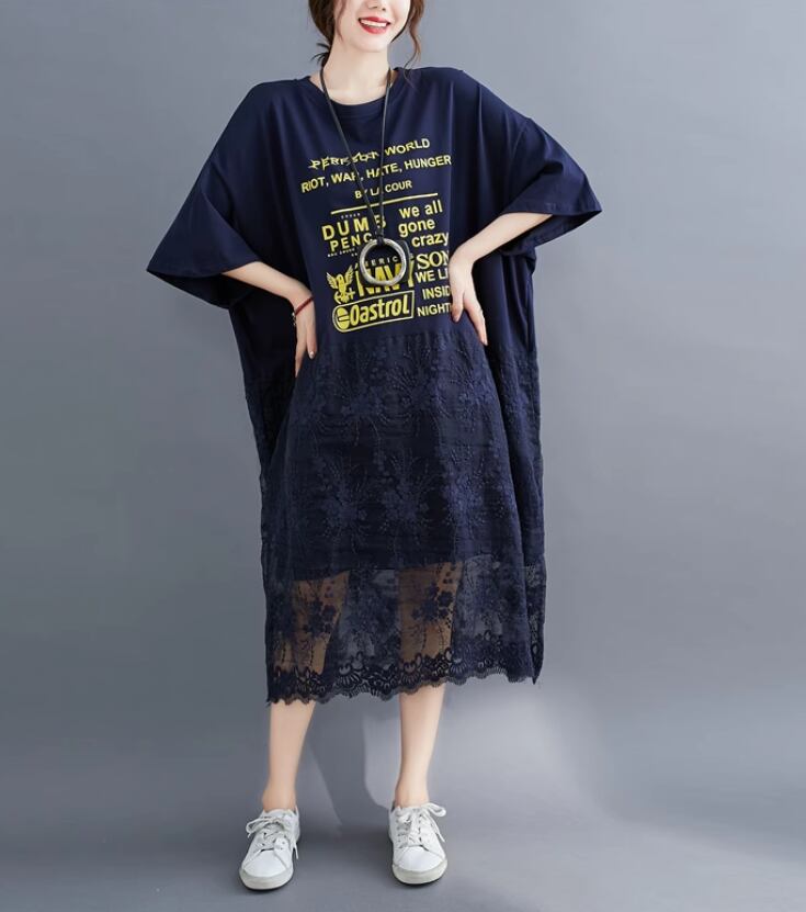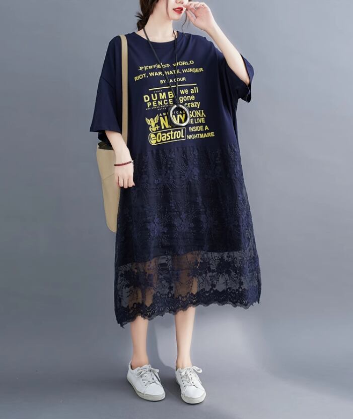 ロンT ロングTシャツ ワンピース レディース 春夏 大きいサイズ カジュアル 五分袖 レース 異素材MIX ガーリー ラウンドネック ゆったり ネイビー ab3362