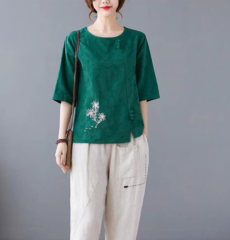 トップス レディース プルオーバー Tシャツ 五分袖 ラウンドネック 刺繍 花刺繍 ゆったり カジュアル オフィス 清楚 グリーン ab3365