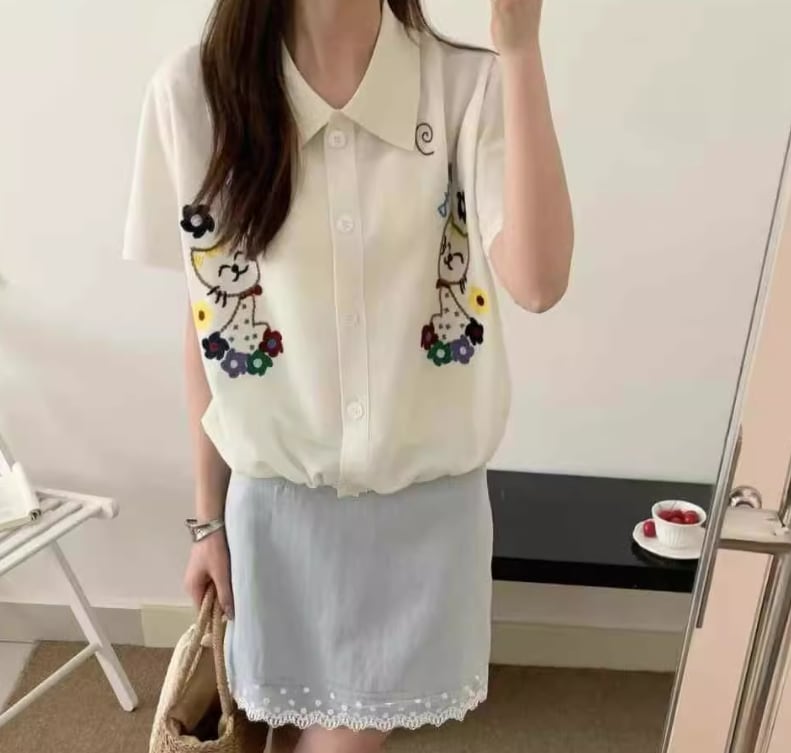 ポロシャツ シャツ レディース 半袖 ネコ 猫 刺繍 レトロ キュート カジュアル フェミニン プチプラ ホワイト ab3408