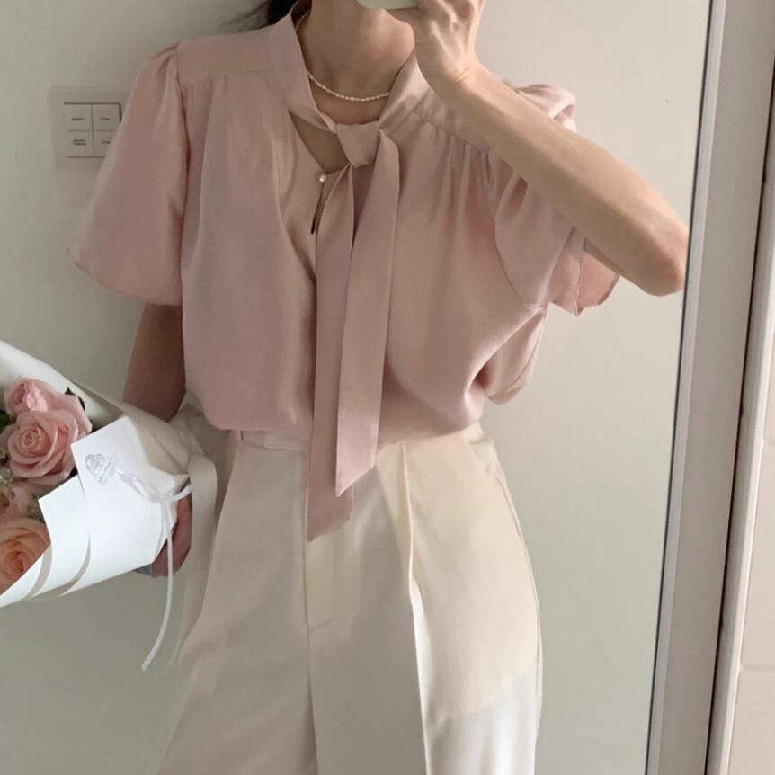 トップス レディース ブラウス 半袖 ボウタイ 前後2way 着回し スタイリッシュ おしゃれ かわいい オフィス 通勤 MH4611