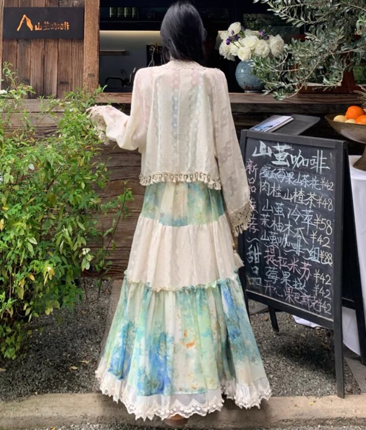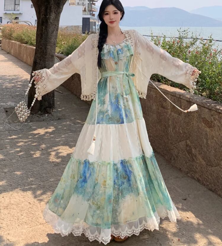 ワンピース キャミワンピ ロング丈 レディース 大きいサイズ 夏ワンピ フリル フェミニン 油絵 ふんわり キュート リゾート デート ab3414
