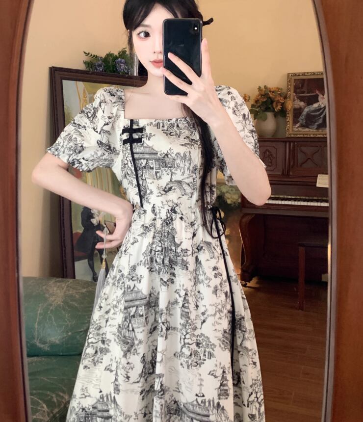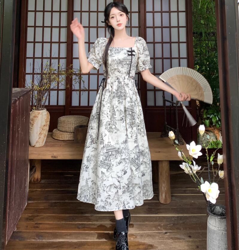 ワンピース レディース 春夏 チャイナ風 レトロ 水墨画 シック 半袖 Aライン ミドル丈 体型カバー パフスリーブ ガーリー ab3415