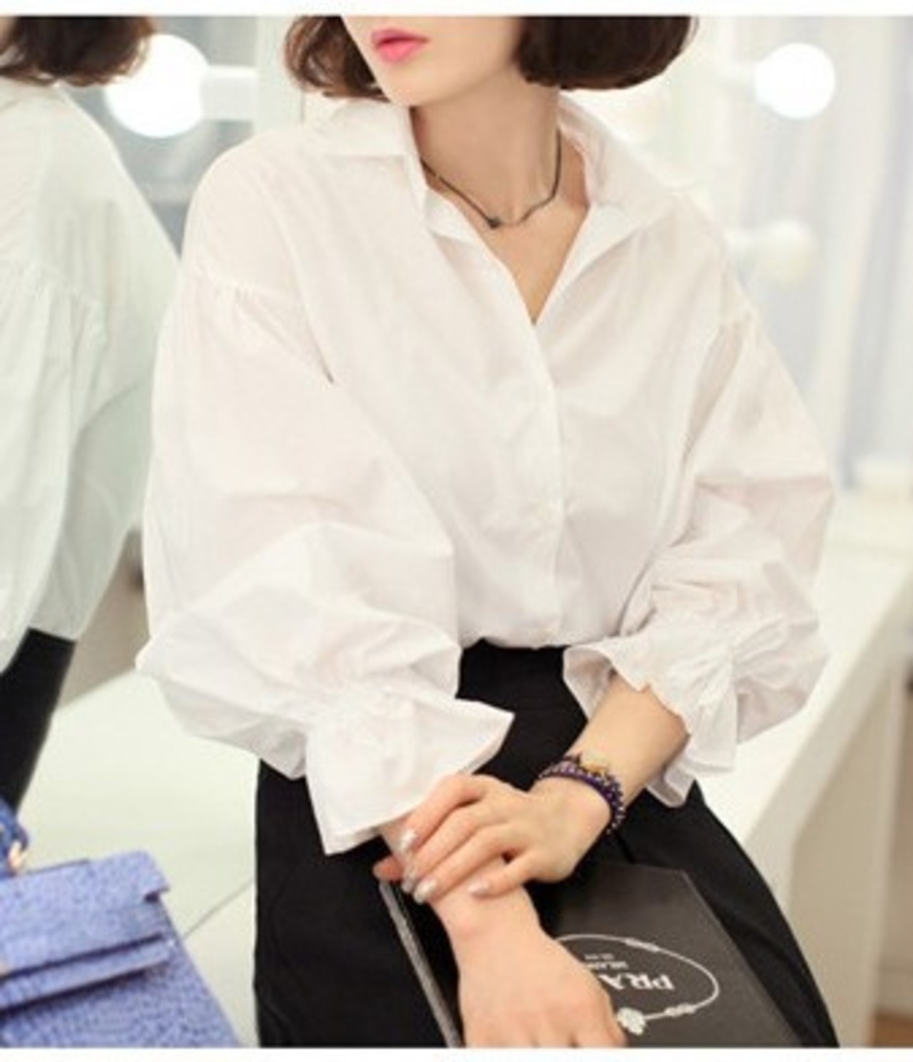 ふんわり♪ ボリューム パフスリーブ ブラウス シャツ 長袖 レディース トップス カットソー スキッパーシャツ シフォンシャツ シフォンブラウス ホワイト 白 リンネル系 大きいサイズ 193-20