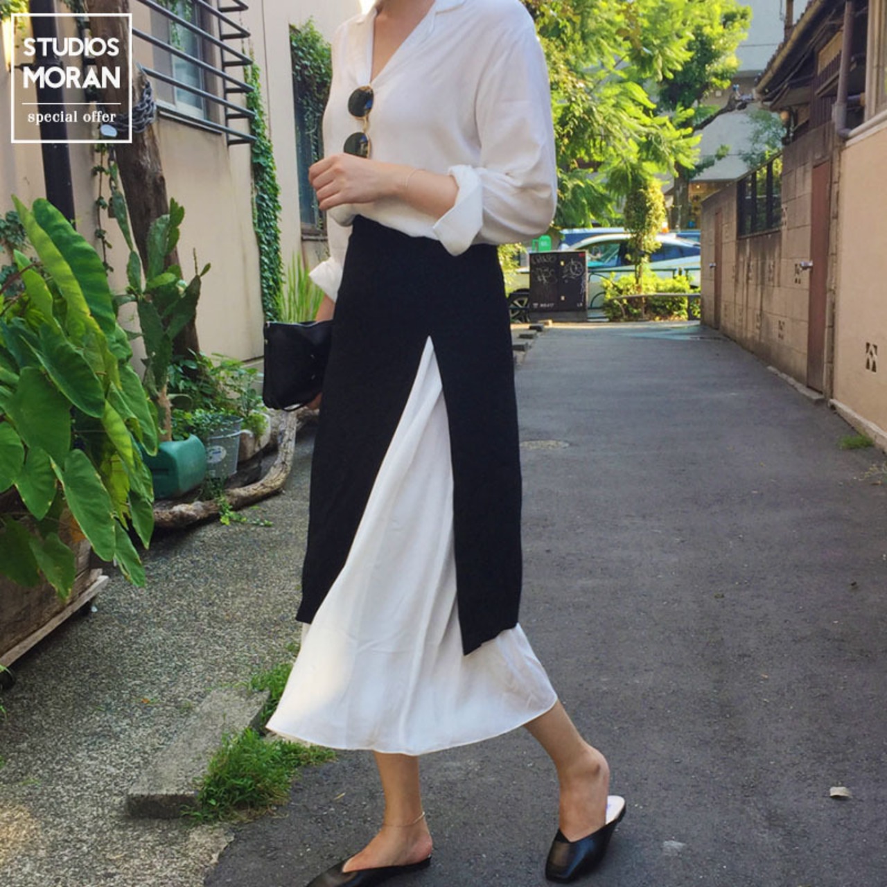 バイカラー イレギュラースカート プリーツスカート シフォンスカート 異素材スカート ひざ丈 膝丈 ミモレ丈 ロング スカート モノクロ リンネル系 大きいサイズ ママコーデ 通勤コーデ 193-24