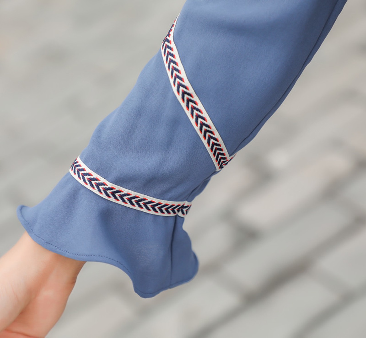 かわいい Vネック ワンピース ブルー Aライン 長袖 切り替え フレア チロリアン ステッチ ワンピース ドレス 大きいサイズ リンネル系 193-33
