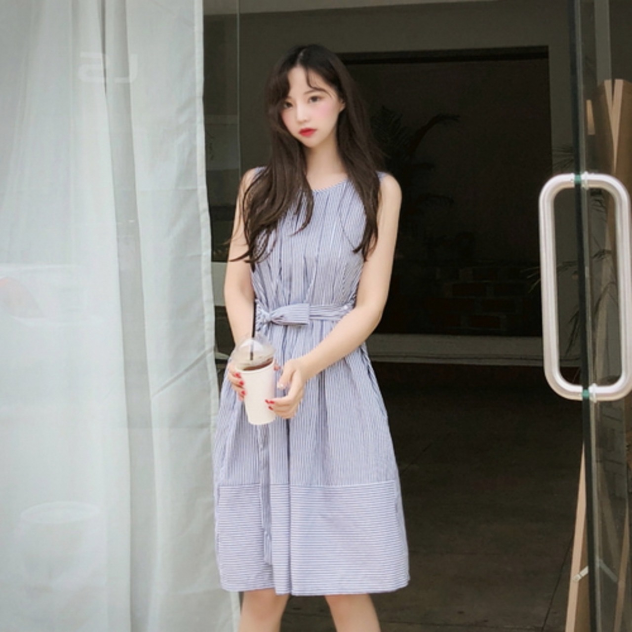 ウエストリボンがかわいいノースリーブワンピースです。