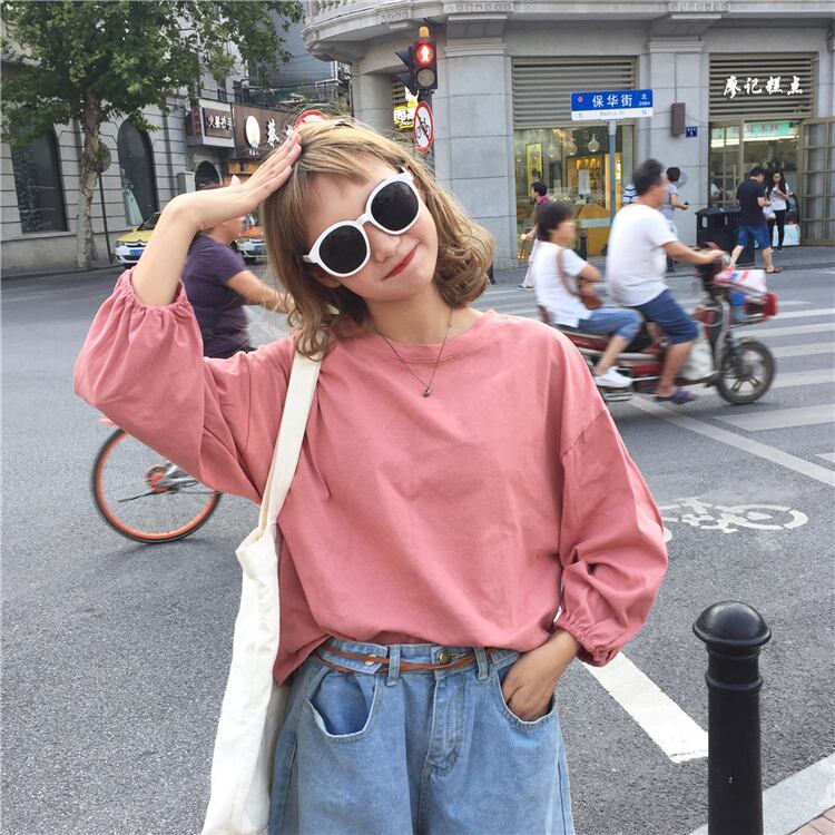 5色展開 シンプル カットソー トップス プルオーバー レディース バルーン袖 シャツ ブラウス リンネル系 大きいサイズ 193-58