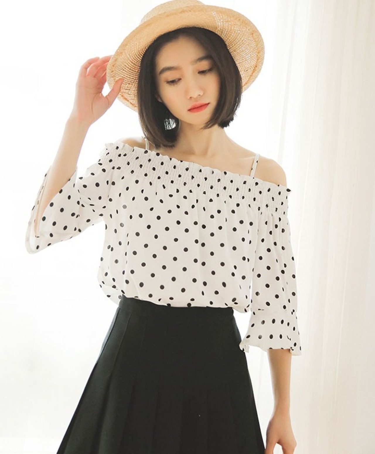 フレア袖のオフショルダートップスです。