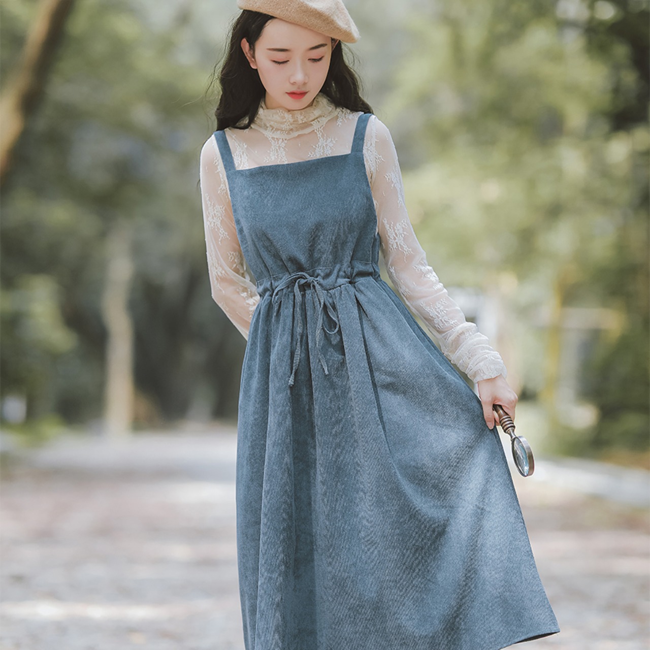 エプロンワンピース コーデュロイ ロング ウエストリボン 秋 ナチュラル MH0024