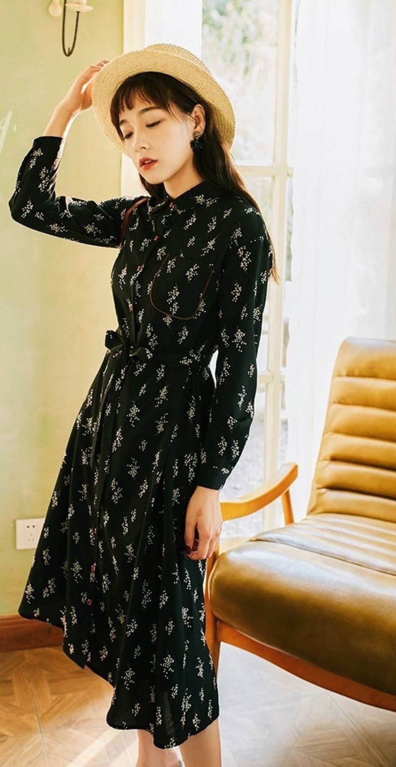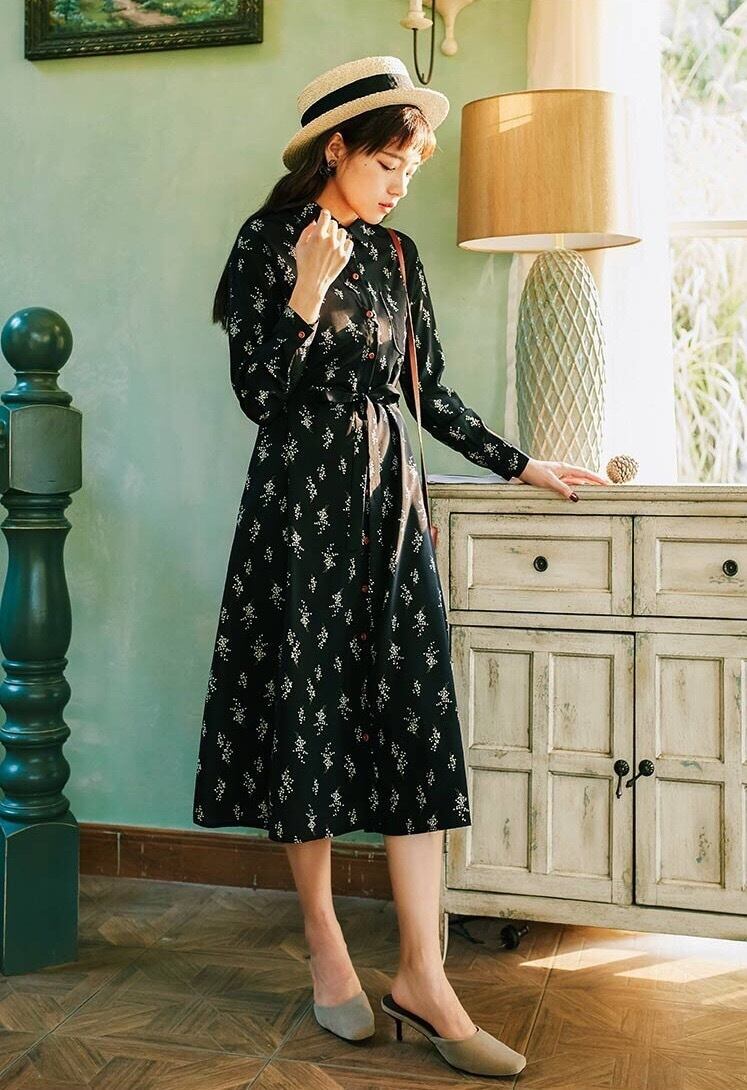秋冬 長袖 ワンピース 膝丈 きれいめ モノトーン フェミニン かわいい ハイウエスト 襟付き 花柄 ボタン リボン th0009