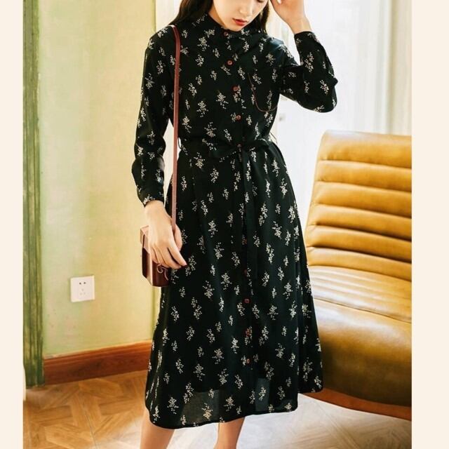 きちんと感がありつつも、小花柄が清楚で上品な印象の長袖ワンピースです。