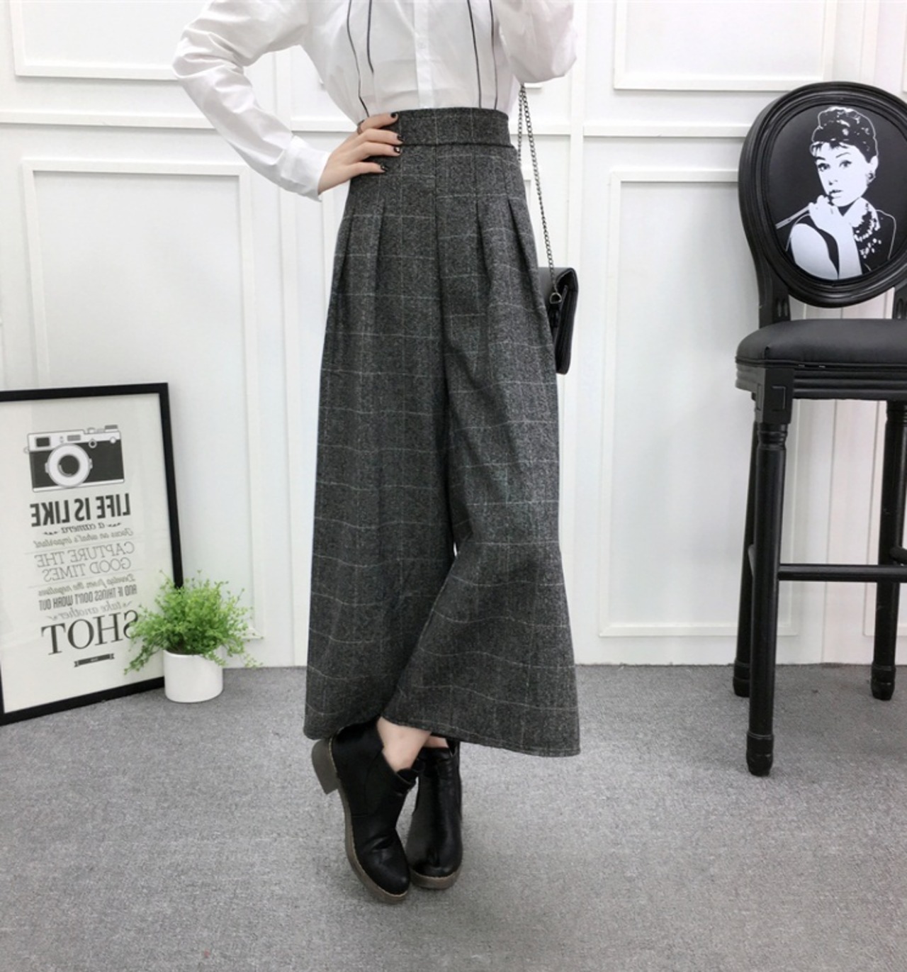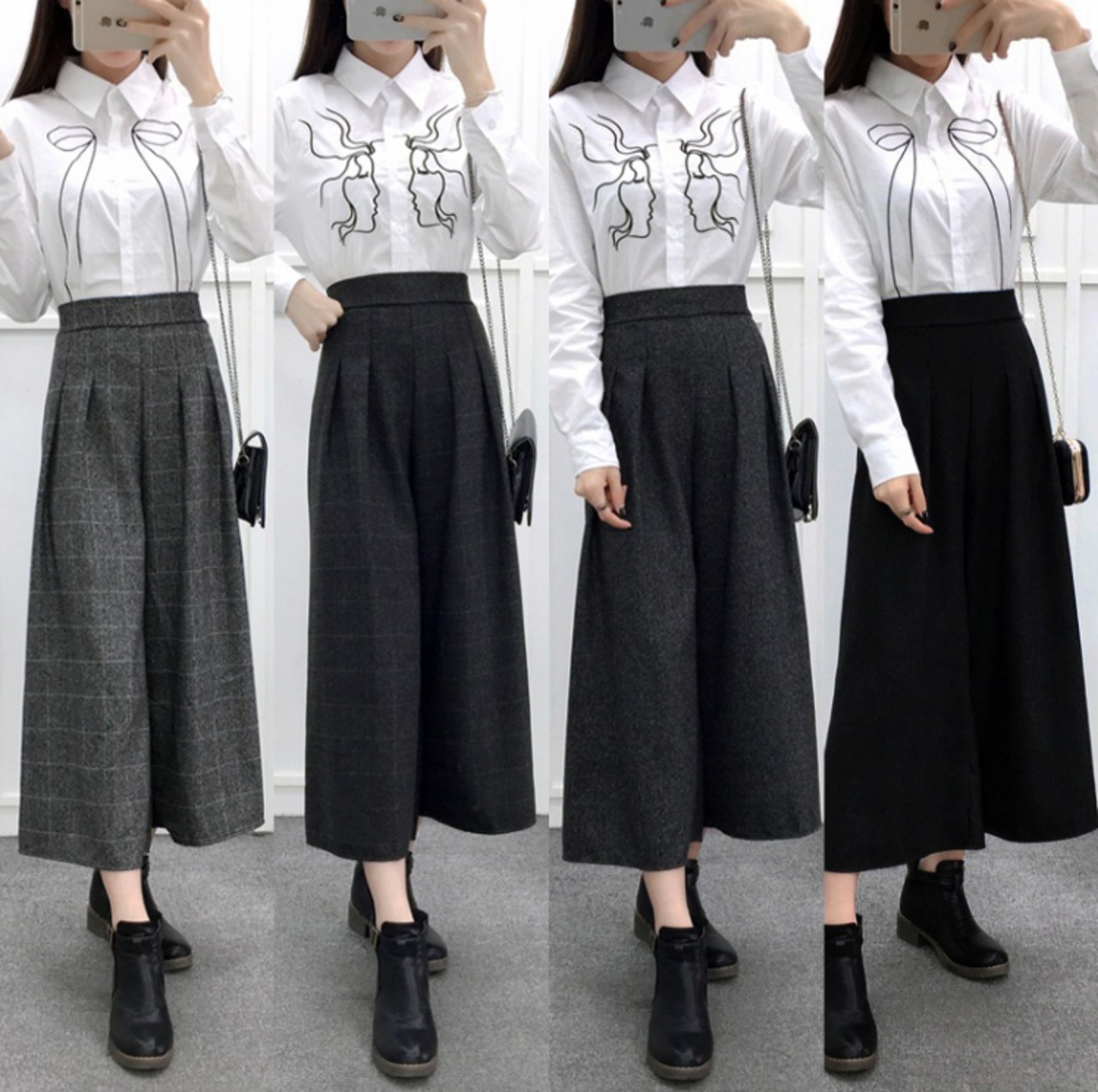 4色展開 ハイウエスト スカンツ ワイドパンツ ウール混 秋冬 通勤 ボトムス