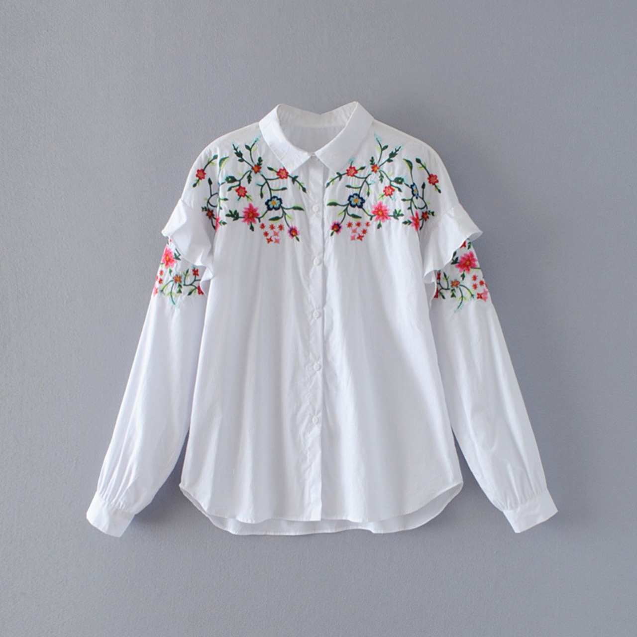 かわいい 刺繍 ブラウス フリルブラウス シャツ スキッパーシャツ レディース シャツ ブラウス 刺繍 長袖 大きいサイズ リンネル系 193-406