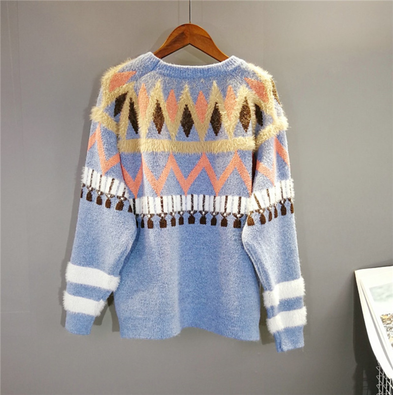 幾何学柄がオシャレなモヘアプルオーバーです。