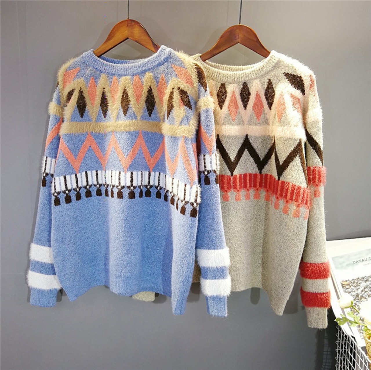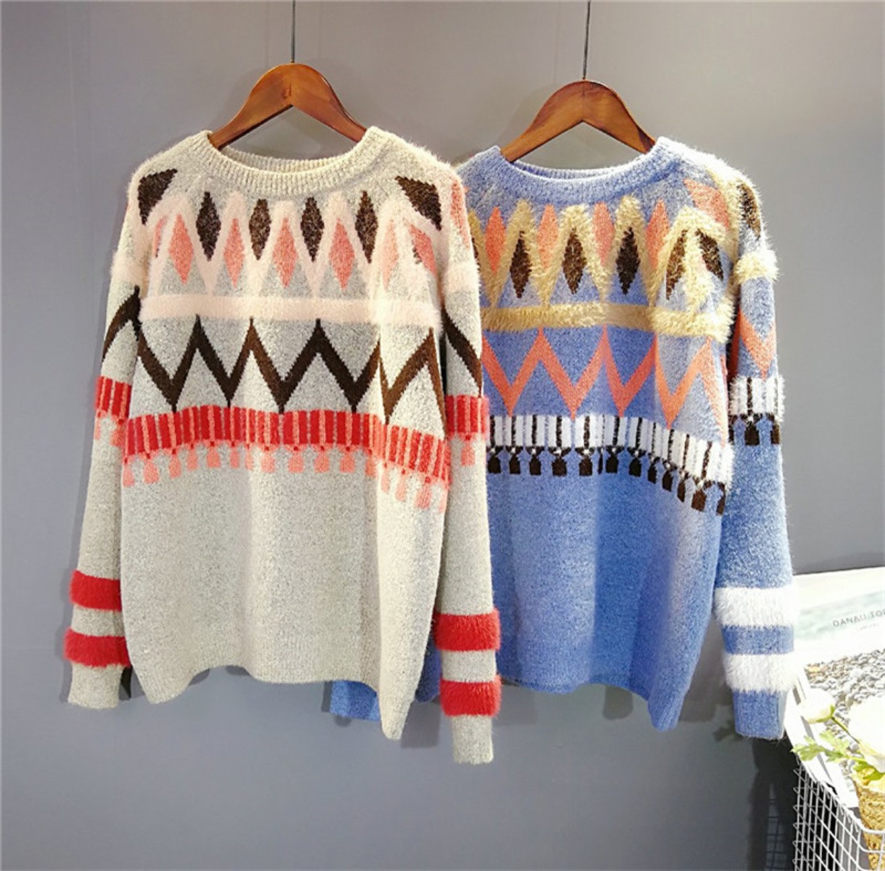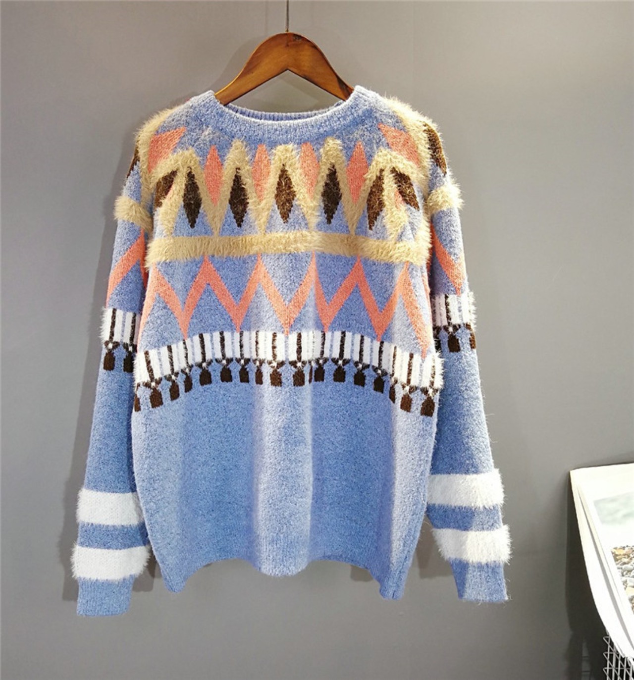 2色展開 モヘア プルオーバー カラフル 幾何学柄 ニット トップス レディース モヘア ナチュラル リンネル系 トップス ニット ゆったり 大きいサイズ 193-485