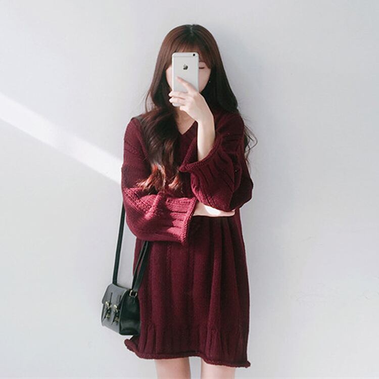 ゆるかわ ニット セーター Vネック チュニック トップス 長袖 MH0215