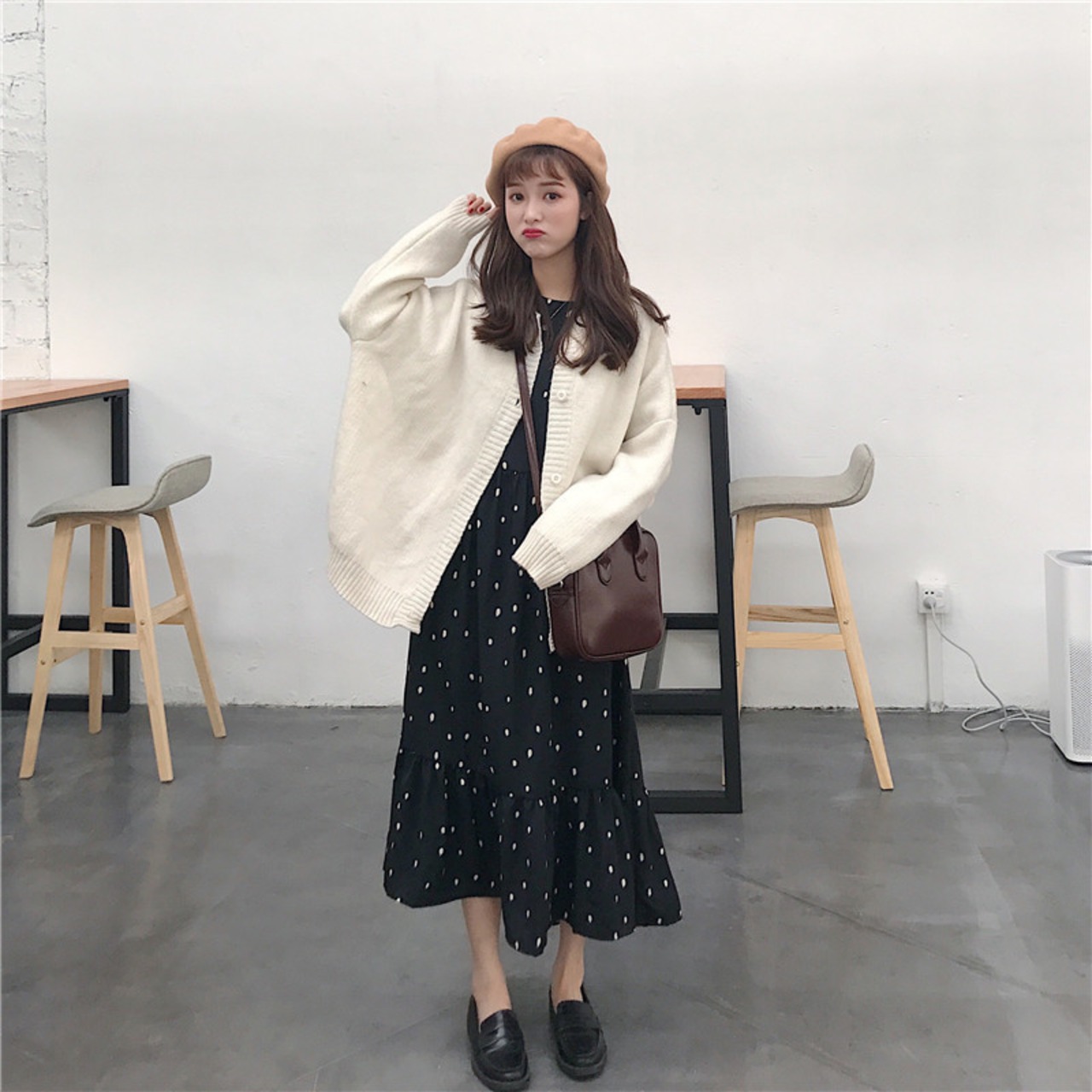 レトロ風 ドット柄 水玉 フリル ロング丈 ワンピース MH0247