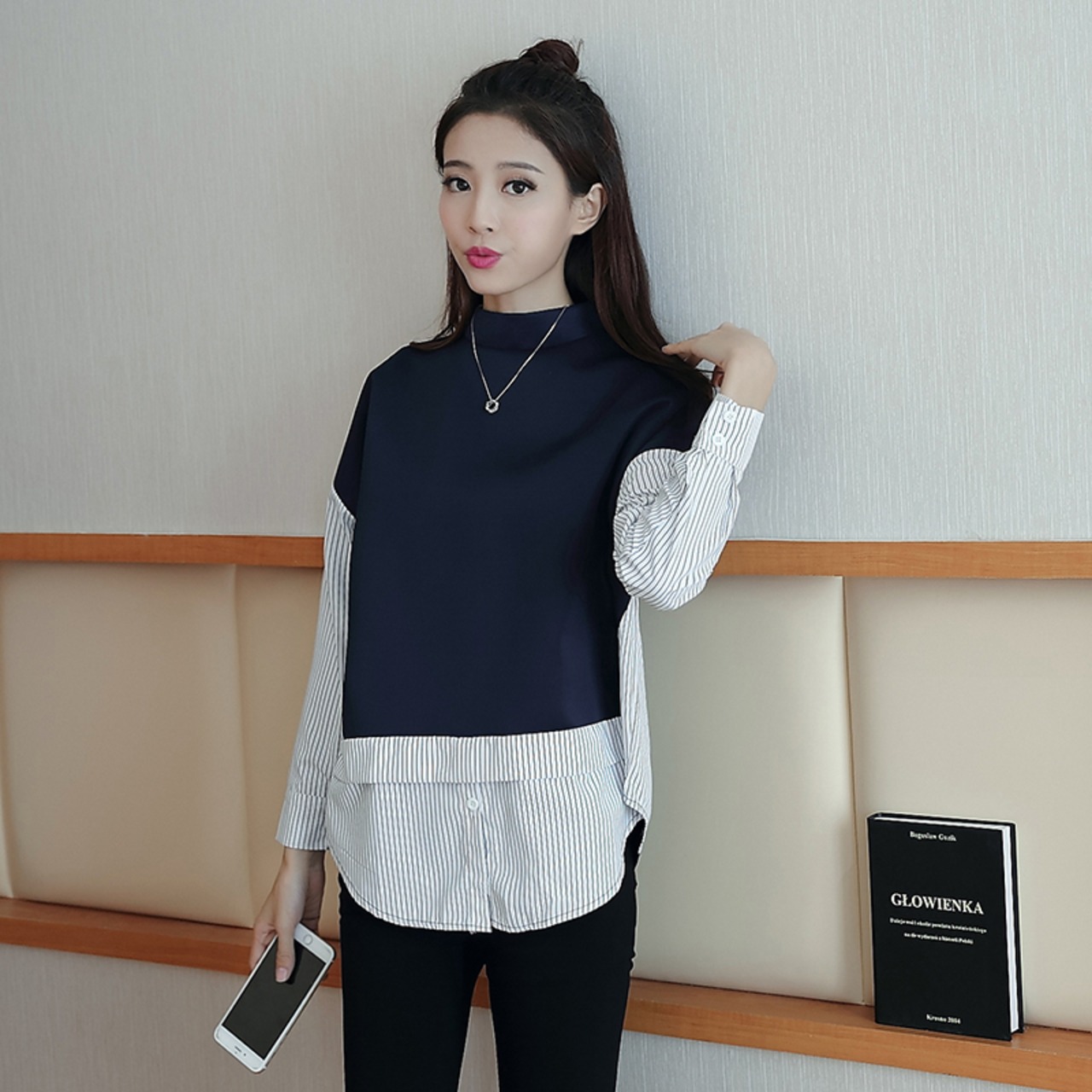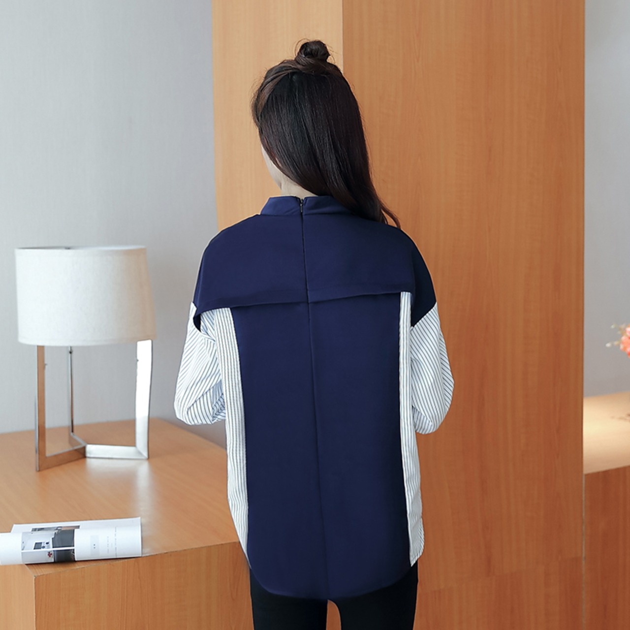 重ね着風 ドッキングシャツ トップス セーター ストライプ スタンドカラー 長袖 MH0334