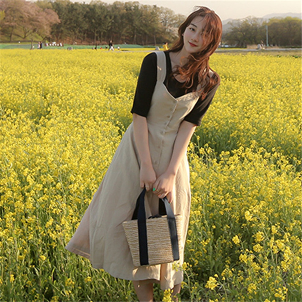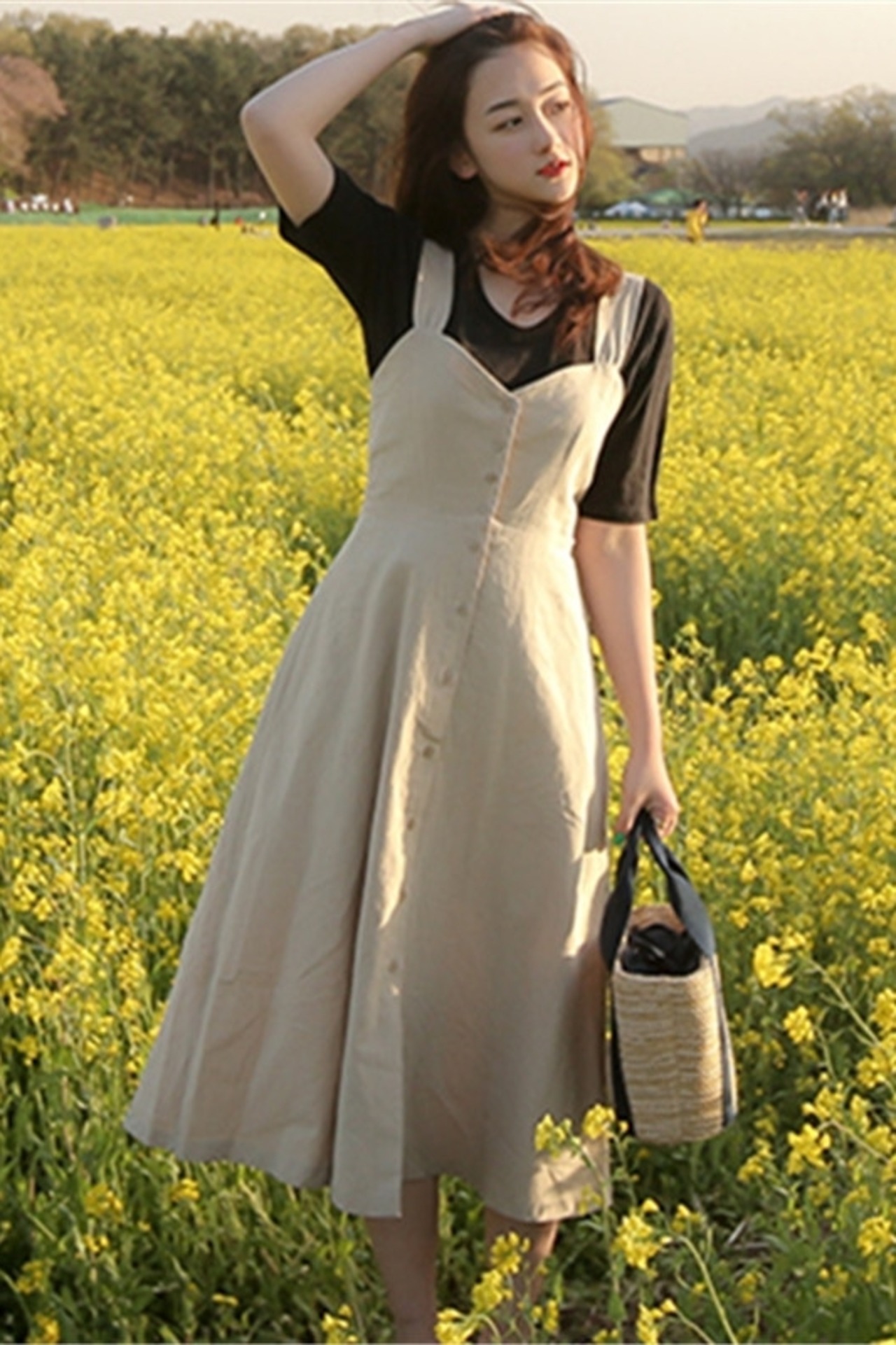 ロング丈 ワンピース サロペットスカート 前ボタン 美ライン マキシ丈 MH0341