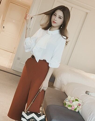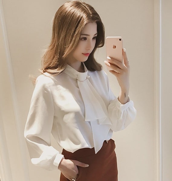 襟もとがクラシカルな、とろみ系ブラウス。