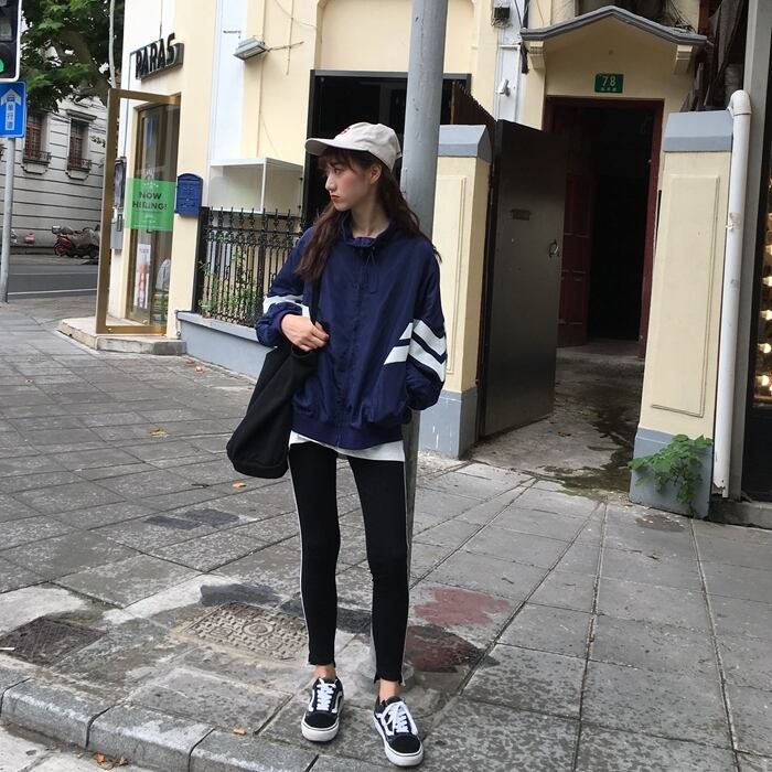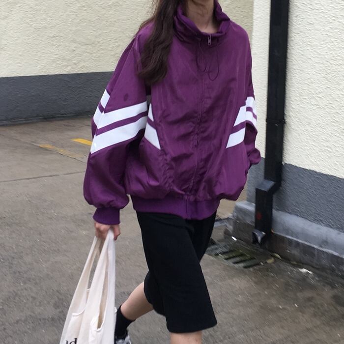 袖にラインの入ったジップアップブルゾン。