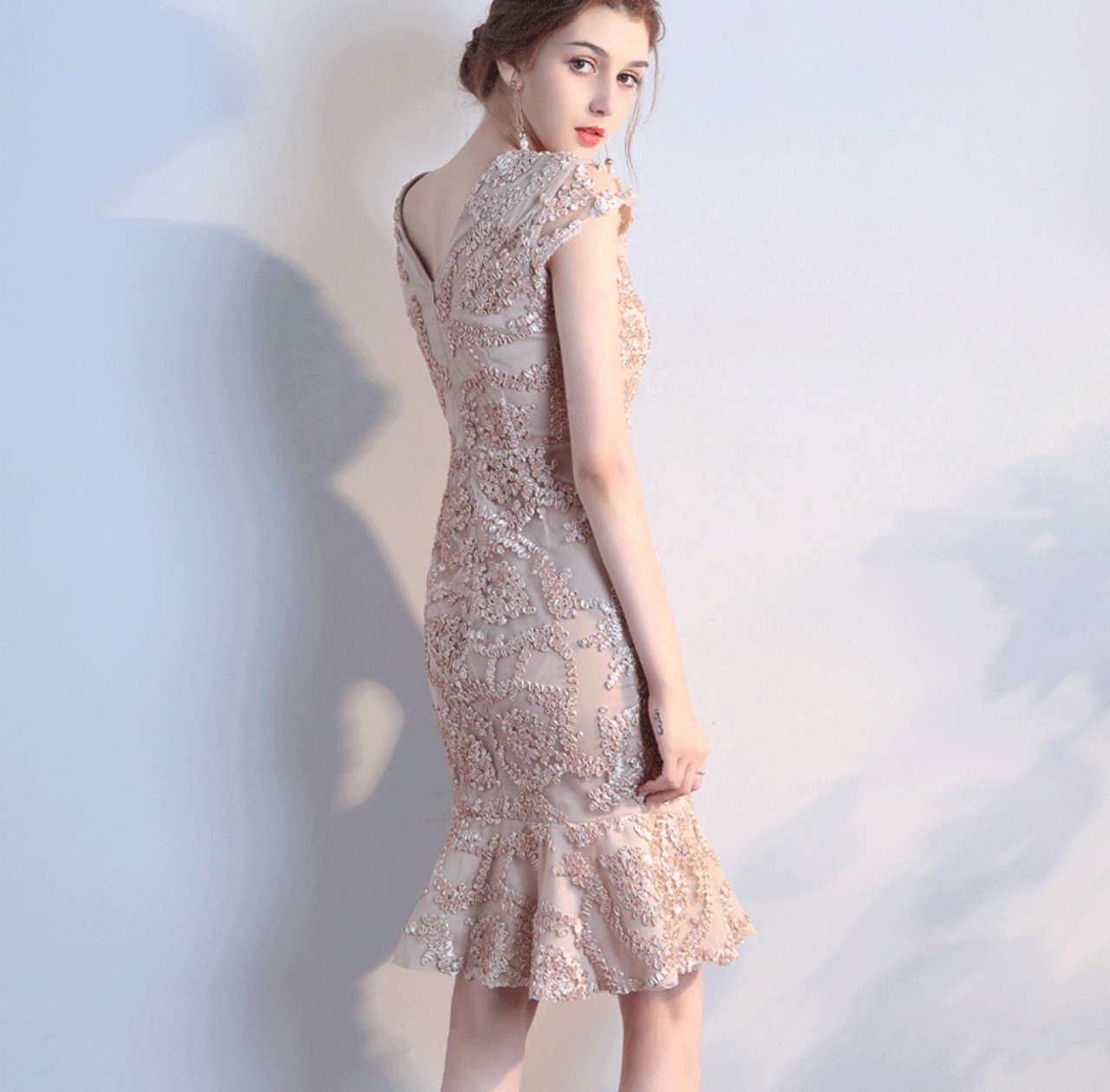 ワンピース ドレス ミニ丈 マーメイド フレア ビジュー スパンコール エレガント 半袖 Vネック パーティ 二次会 結婚式 yi602