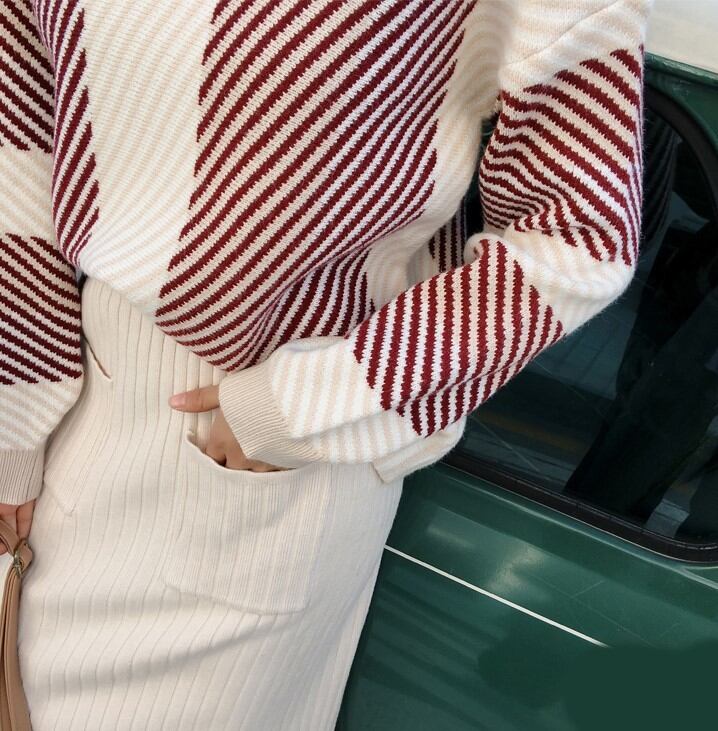 セットアップ ニット セーター スカート ミディ丈 ニットスカート タイト 無地 ストライプ 通勤 オフィス 秋冬 yi614