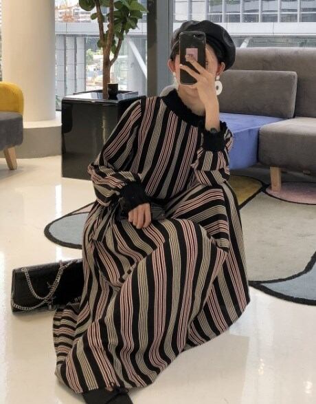 ワンピース ロング丈 ストライプ ニットワンピ ハイネック 長袖 ゆったり レトロ バルーン袖 シック ab1006