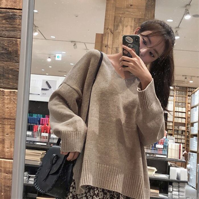 Vネック ニット セーター ニットセーター トップス 長袖 プルオーバー 無地 シンプル ゆったり とろみ感 体型カバー ママファッション ママコーデ MH0632