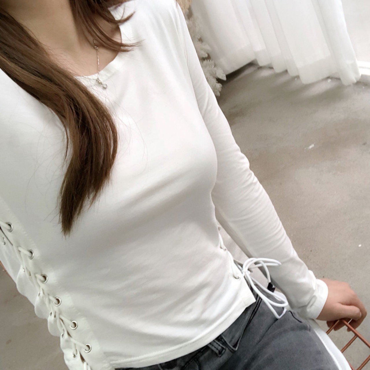 カットソー レディース 長袖 トップス クルーネック 無地 編み上げ シンプル セクシー スリム カジュアル 秋 冬 MH0638