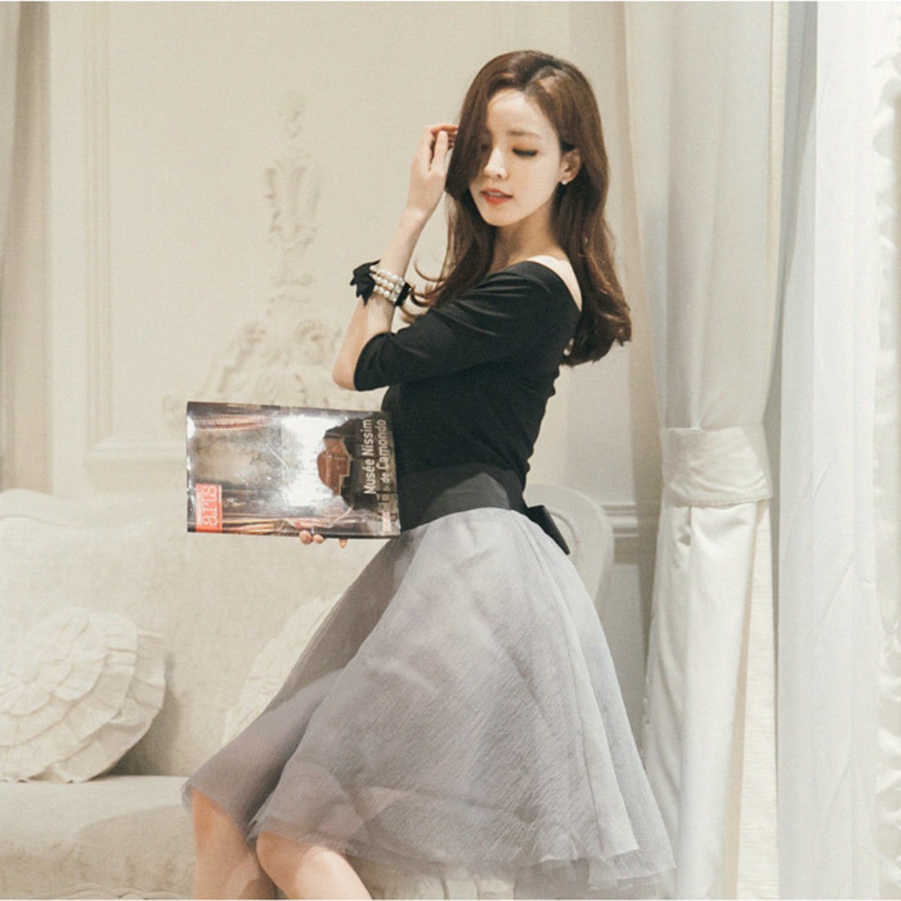 スカート部分のウエストリボンとチュールスカートがフェミニンで大人可愛いです。