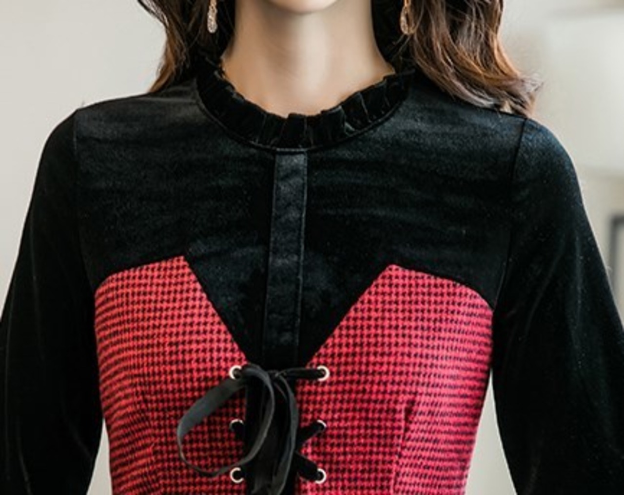 ドッキングワンピ ワンピース レディース 秋冬 ミニ丈 長袖 クルーネック フレア袖 レトロ ハイウエスト ab1075