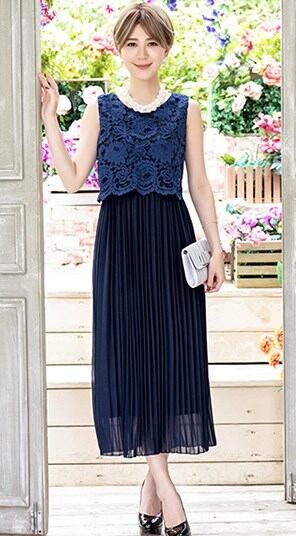 ドレス ワンピース ドッキングワンピ フォーマル レース プリーツスカート ロング丈 レディース パーティー 結婚式 ノースリーブ ネイビー ab1119