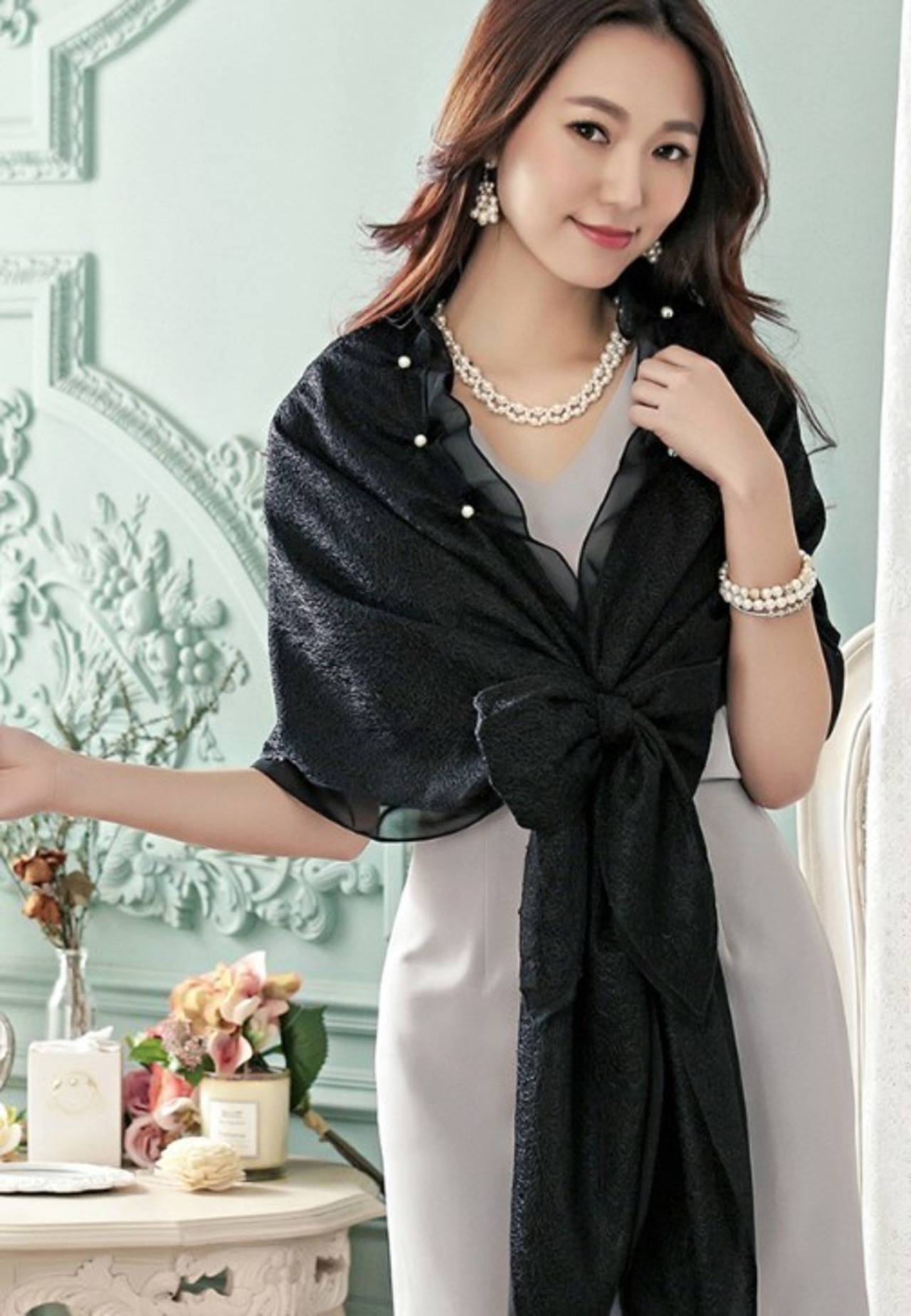 ストール ショール レディース パーティー 結婚式 ロング丈 2way リボン フリル エレガント ブラック ab1123