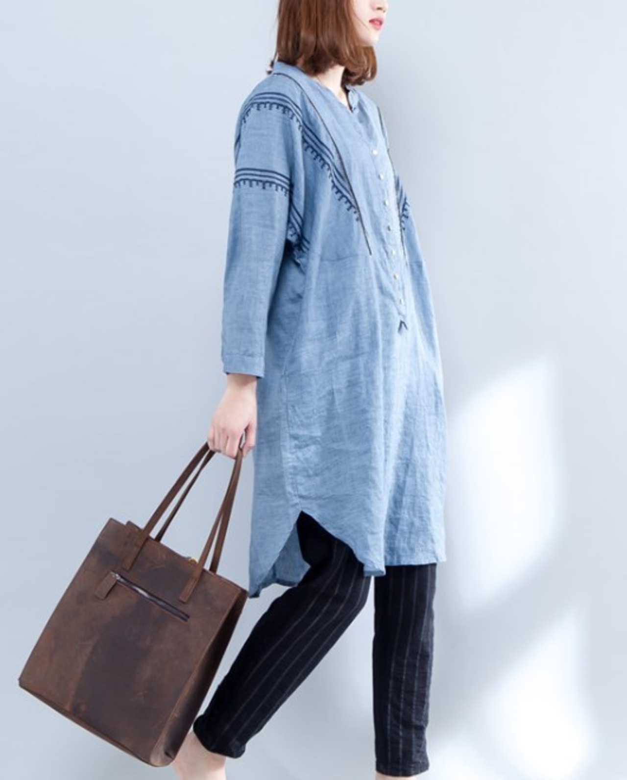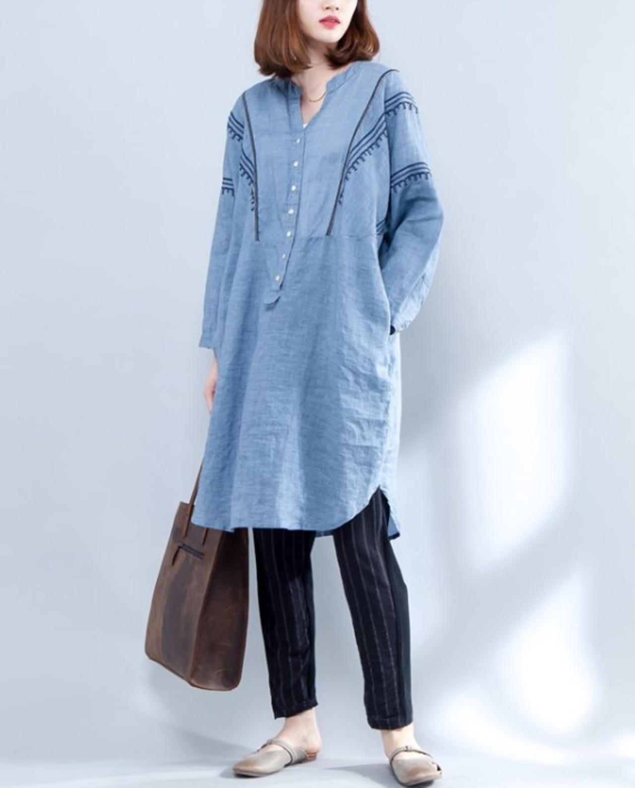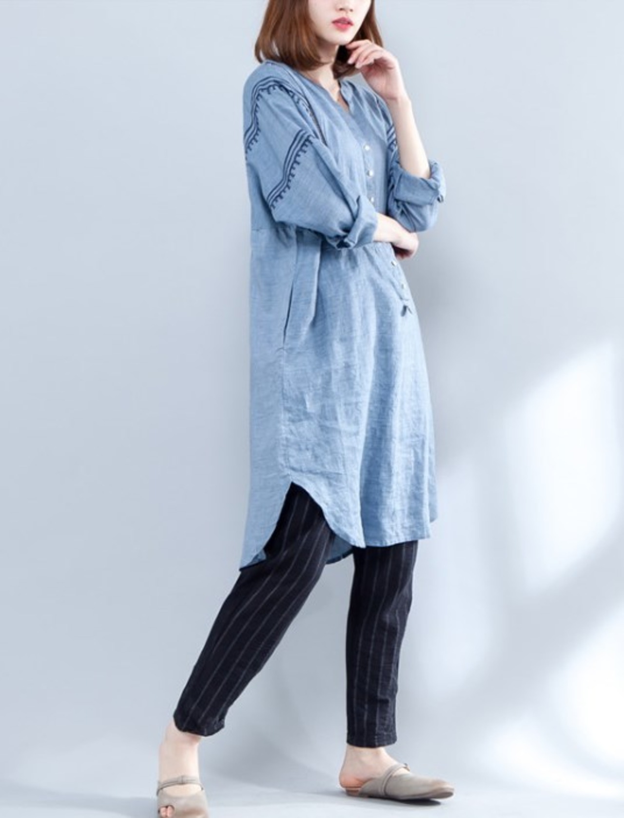 シャツワンピース チュニック レディース シャツ プルオーバー Vネック 長袖 ゆったり Aライン ふんわり ab1154