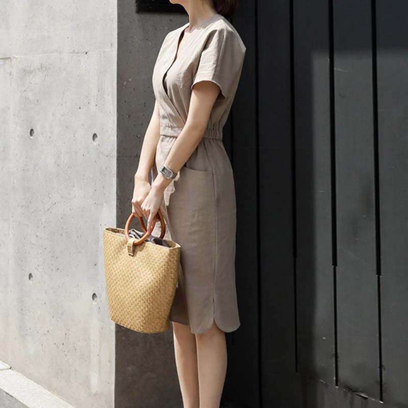 ワンピース レディース ひざ丈 半袖 無地 カシュクール シンプル 通勤 オフィス 春夏 yi688