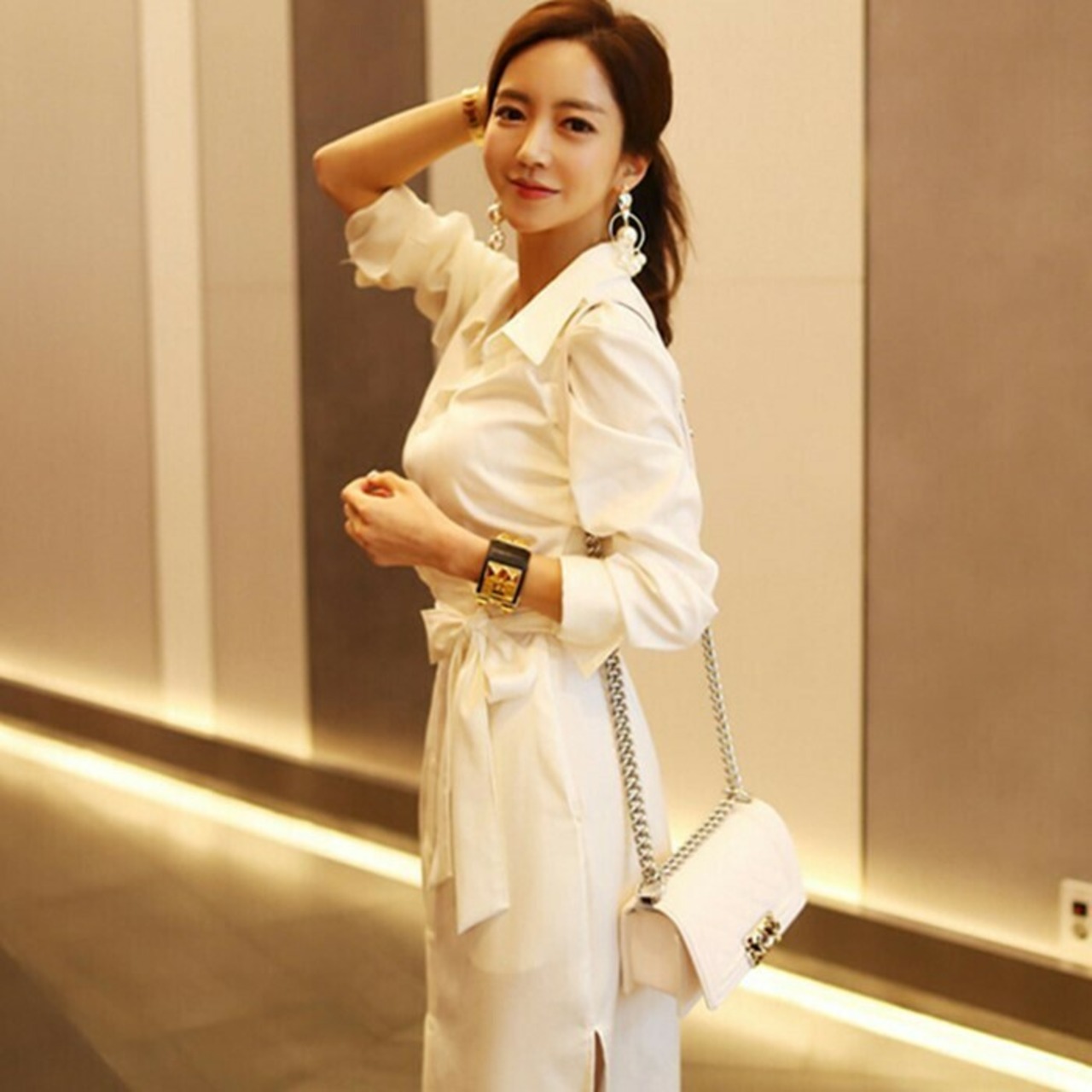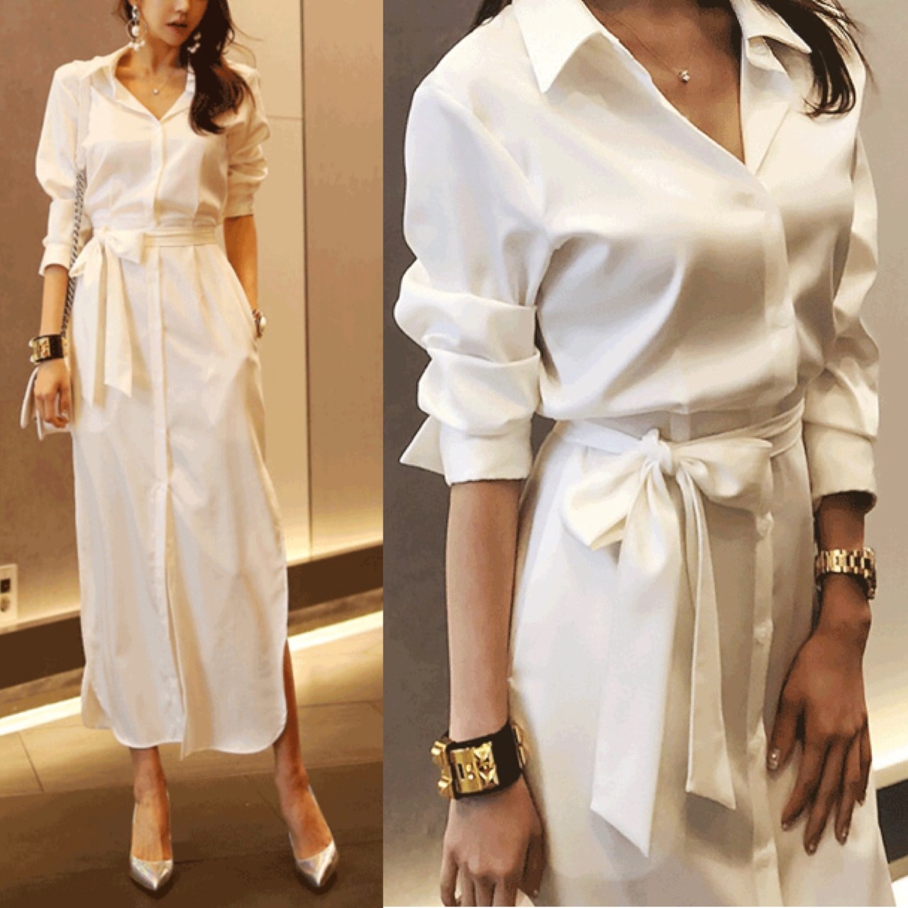 ワンピース レディース ロング丈 ロングワンピース シャツワンピース 無地 白 ウエストリボン きれいめ オフィス 通勤 春夏 yi758