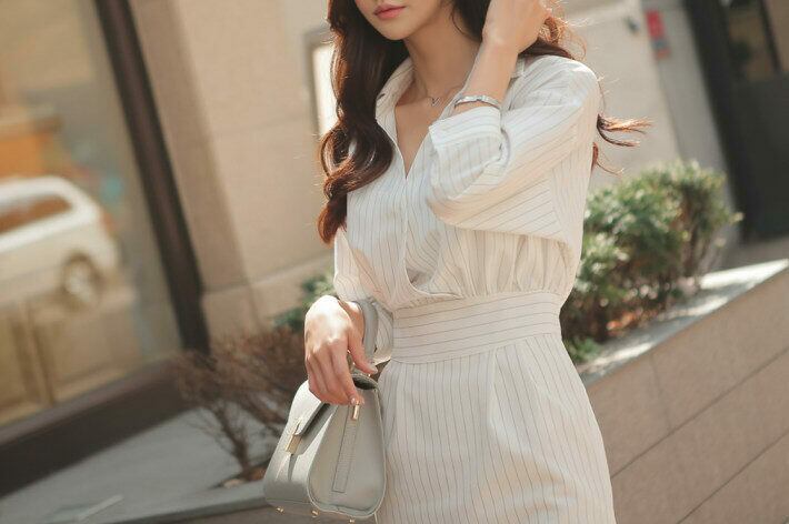 ワンピース レディース ひざ丈 ロングワンピース 7分袖 ストライプ ウエストマーク きれいめ シャツ オフィス 通勤 春夏 yi763