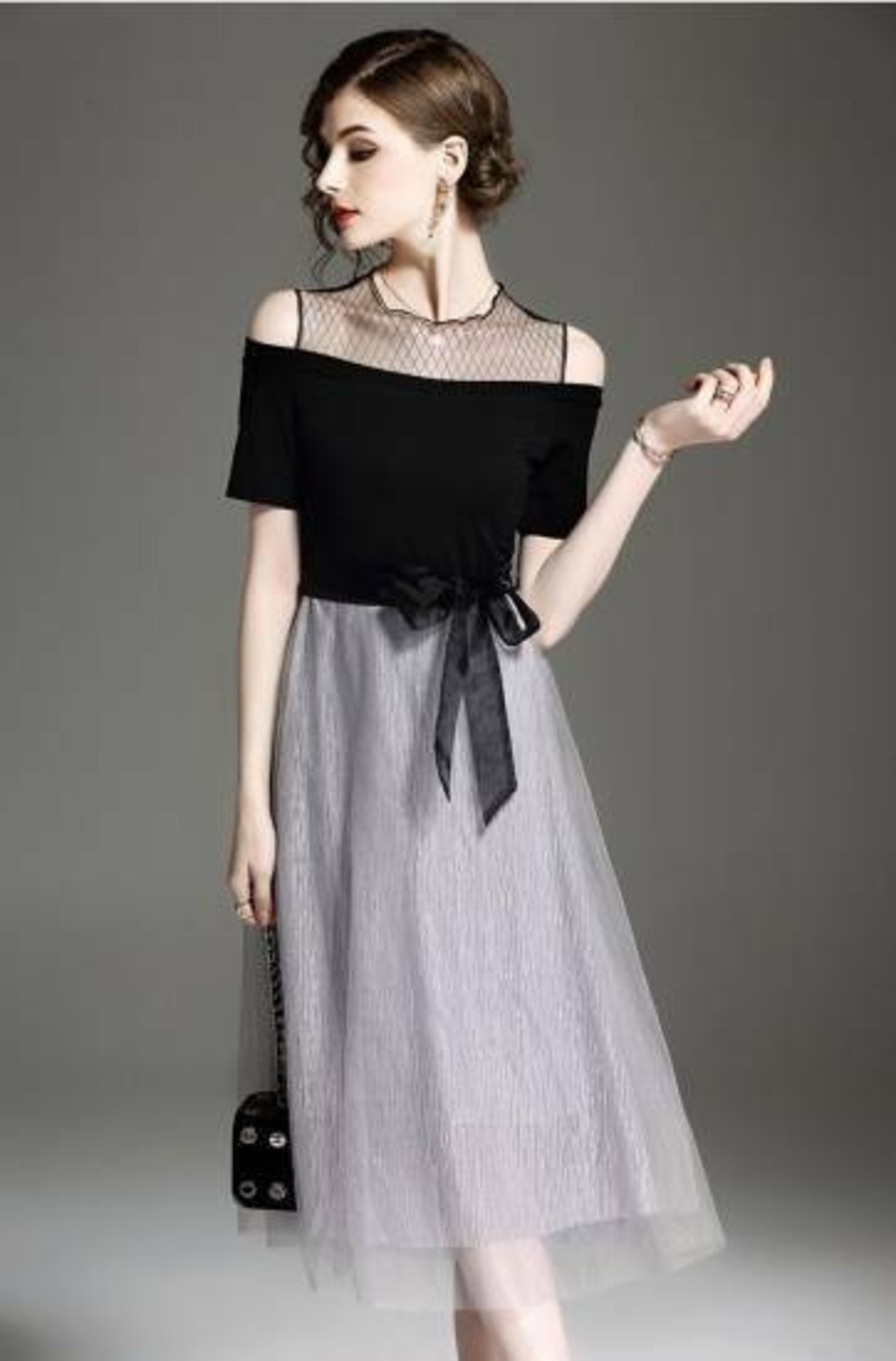 パーティードレス 結婚式 二次会 お呼ばれ ドレス 20代 30代 40代 ワンピース ひざ下丈 ロングワンピース オフショルダー 無地 黒 ウエストリボン yi783