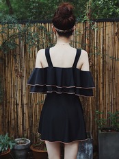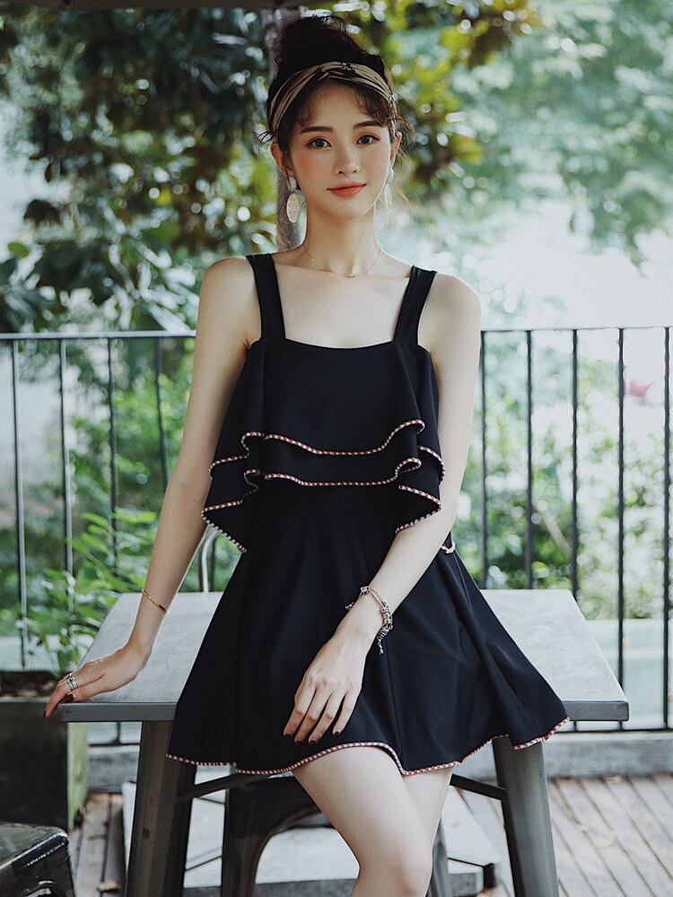 水着 レディース ワンピース水着 無地 黒 フリル 体型カバー 大人かわいい ガーリー フェミニン 大きいサイズ 夏 yi787