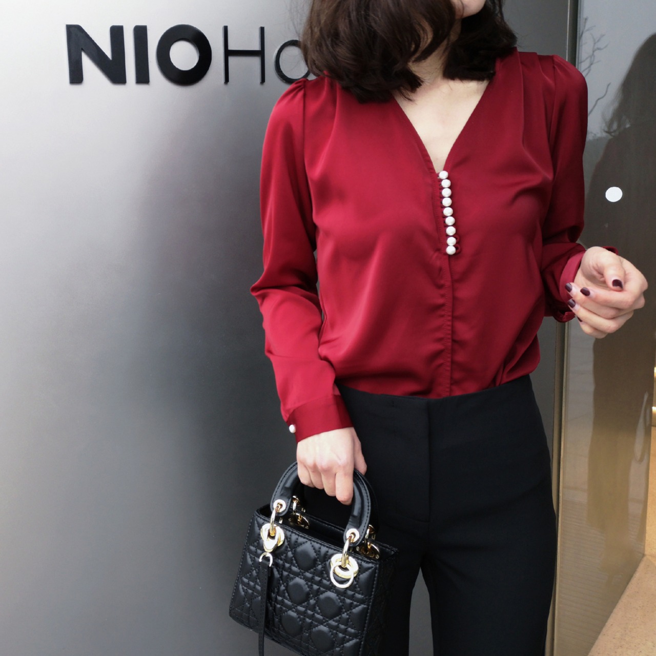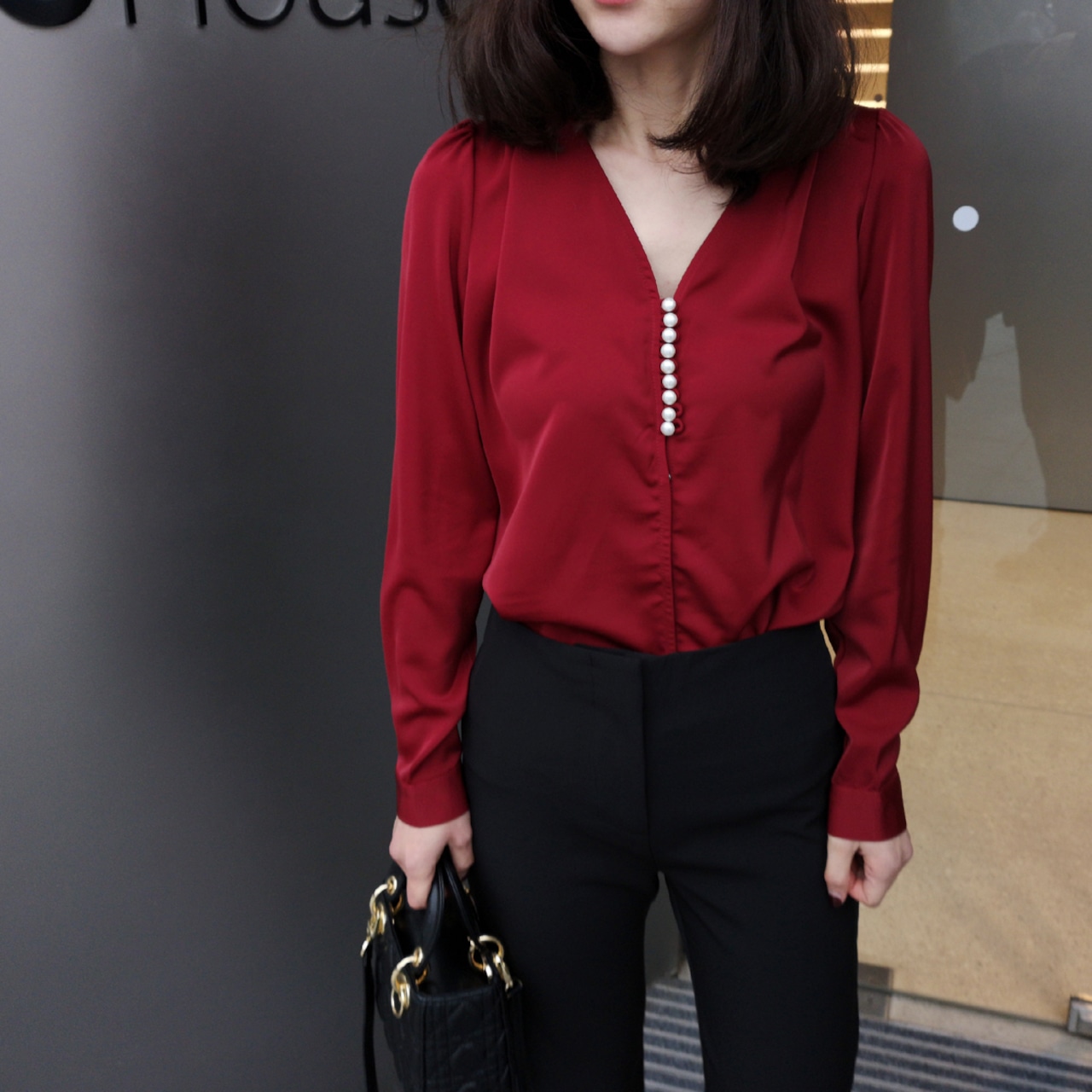 ブラウス レディース 長袖 無地 Vネック ボタンデザイン フェミニン サテン きれいめ エレガント ワインレッド 春夏yi821