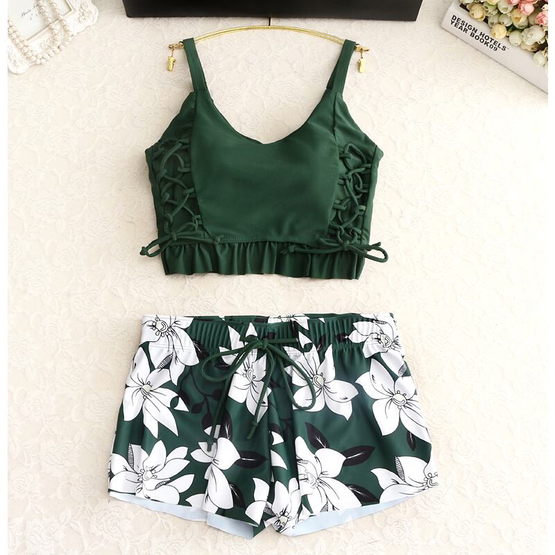 水着3点セット 花柄 網ひも タンキニ ボクサー+ショーツ 上下色違い 花柄 ビキニ ショートパンツ ビーチ リゾート 海 ガーリー カジュアル MH0913