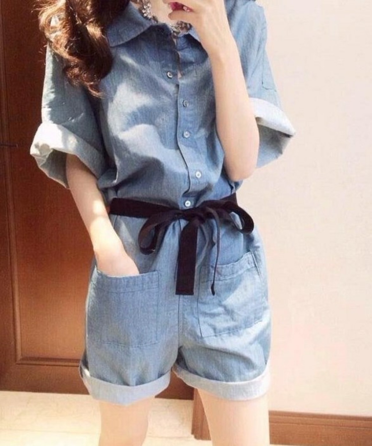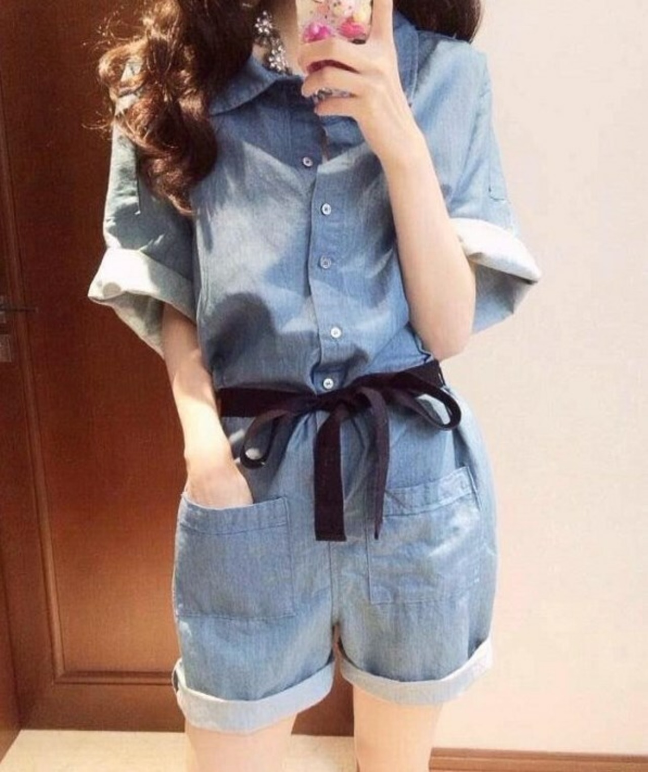 オーバーオール デニム 春夏 ショート丈 レディース ウエストマーク シャツ ワイドパンツ 半袖 カジュアル ab1223