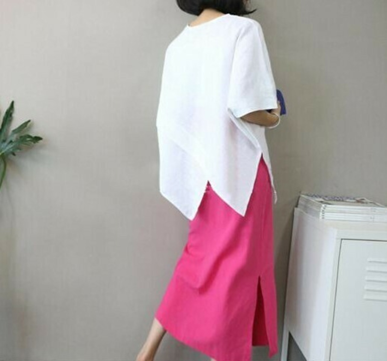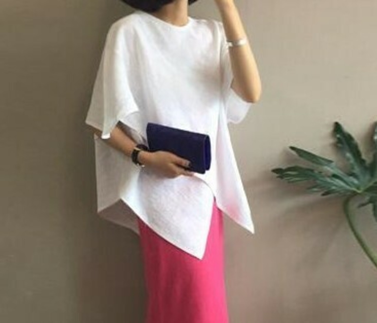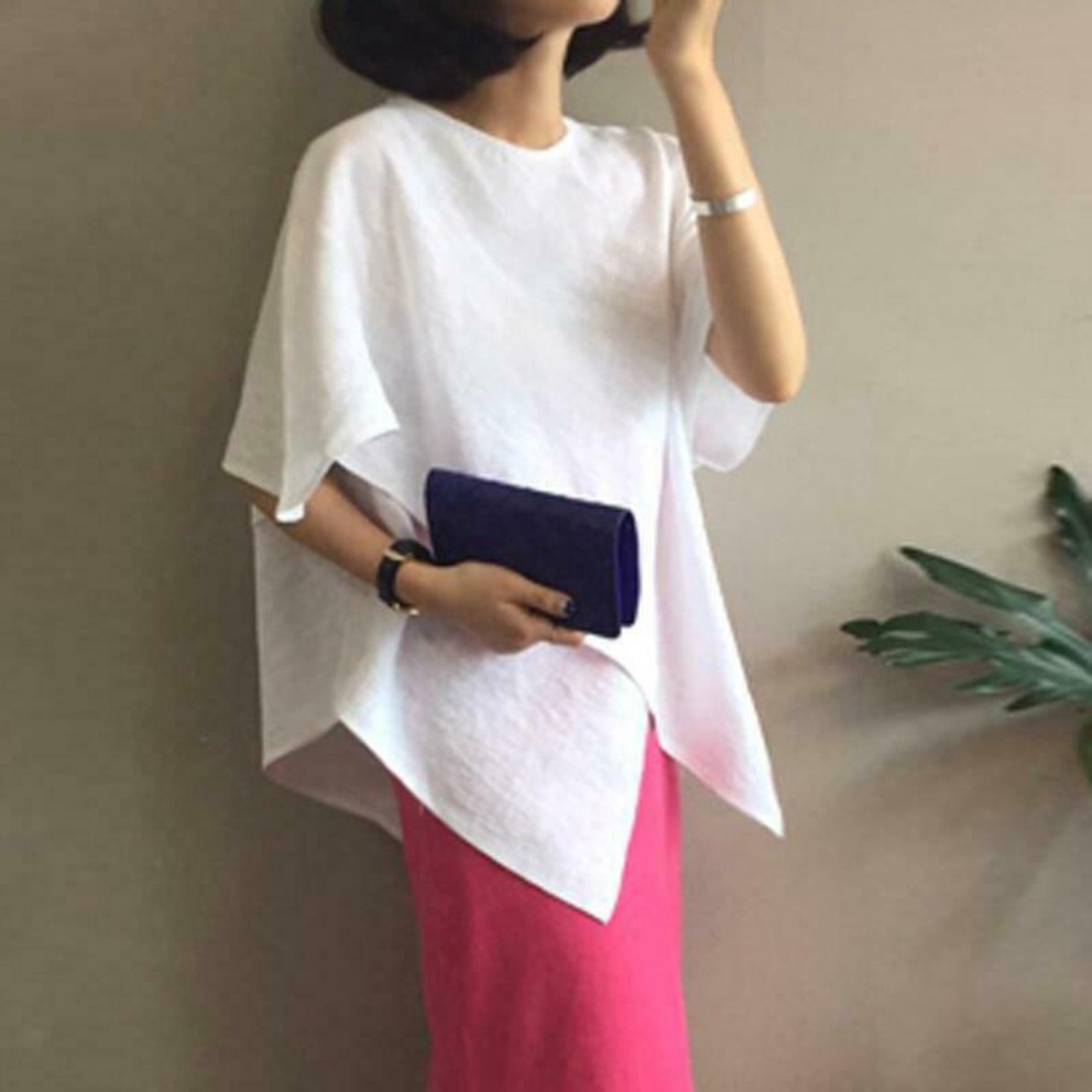 Tシャツ レディース 半袖 5分袖 無地 白 クルーネック デザインカット ゆったり 体型カバー 大きいサイズ カジュアル 春夏yi877