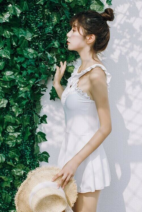水着 レディース ワンピース水着 無地 白 フリル スカート ホルターネック 体型カバー ガーリー フェミニン 夏yi887